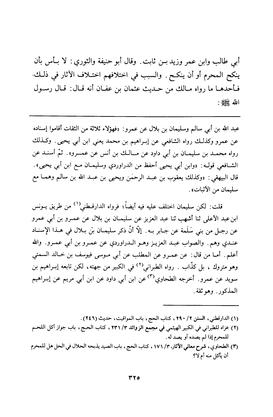عبد الله بن أبي سالم وسليمان بن بلال عن عمرو: "فهؤلاء ثلاثة من الثقات أقاموا إسناده عن عمرو وكذلك رواه الشافعي عن إبراهيم بن محمد يعني ابن أبي يحيى. وكذلك رواه محمد بن سليمان بن أبي داود عن مالك بن أنس عن عمرو". ثمّ أسند عن الشافعي قوله: "وابن أبي يحيى أحفظ من الدراوردي وسليمان مع ابن أبي يحيى". قال البيهقي: "وكذلك يعقوب بن عبد الرحمن ويحيى بن عبد الله بن سالم وهما مع سليمان من الأثبات".