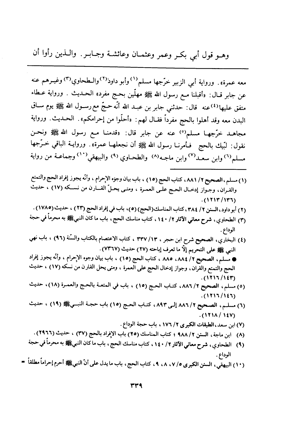 معه عمرة". ورواية أبي الزبير خرّجها مسلم وأبو داود والطحاوي وغيرهم عنه عن جابر قال: "أقبلنا مع رسول الله - صلى الله عليه وسلم - مهلّين بحج مفرد" الحديث. ورواية عطاء متفق عليها عنه قال: حدثني جابر بن عبد الله أنّه حجّ مع رسول الله - صلى الله عليه وسلم - يوم ساق البدن معه وقد أهلوا بالحج مفردًا فقال لهم: "أحلّوا من إحرامكم". الحديث. ورواية مجاهد خرّجها مسلم عنه عن جابر قال: "قدمنا مع رسول الله - صلى الله عليه وسلم - ونحن نقول: لبّيك بالحج فأمرنا رسول الله - صلى الله عليه وسلم - أن نجعلها عمرة". ورواية الباقي خرّجها مسلم وابن سعد وابن ماجه والطحاوي والبيهقي وجماعة من رواية