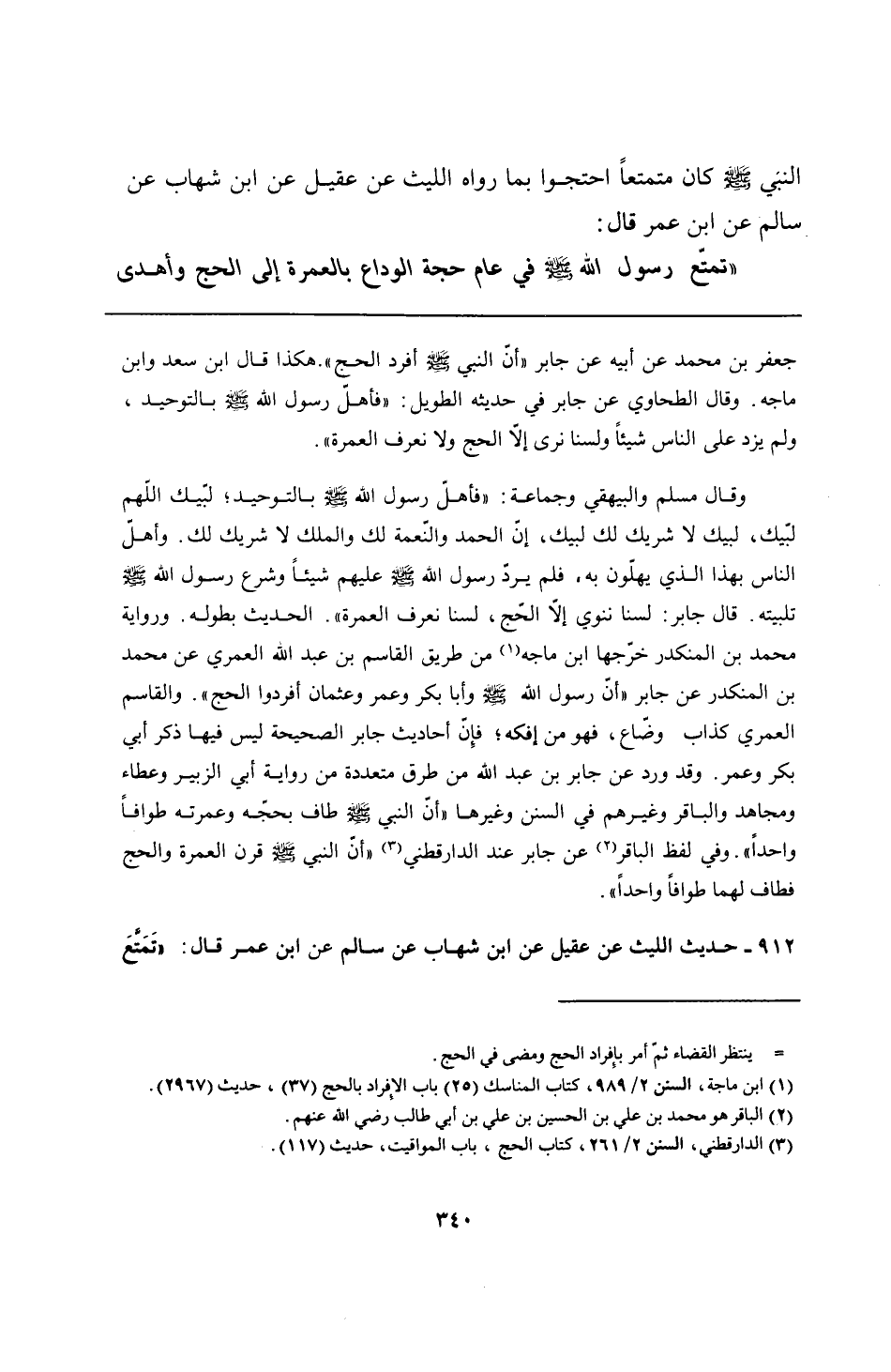 وقال مسلم والبيهقي وجماعة: "فأهلّ رسول الله - صلى الله عليه وسلم - بالتوحيد؛ لبّيك اللهم لبّيك، لبيك لا شريك لك لبيك، إنّ الحمد والنّعمة لك والملك لا شريك لك. وأهلّ الناس بهذا الذي يهلّون به، فلم يردّ رسول الله - صلى الله عليه وسلم - عليهم شيئًا وشرع رسول الله - صلى الله عليه وسلم - تلبيته. قال جابر: لسنا ننوي إلَّا الحج، لسنا نعرف العمرة". الحديث بطوله. ورواية محمد بن المنكدر خرّجها ابن ماجه من طريق القاسم بن عبد الله العمري عن محمد بن المنكدر عن جابر "أن رسول الله - صلى الله عليه وسلم - وأبا بكر وعمر وعثمان أفردوا الحج". والقاسم العمري كذاب وضّاع، فهو من إفكه؛ فإِنّ أحاديث جابر الصحيحة ليس فيها ذكر أبي بكر وعمر. وقد ورد عن جابر بن عبد الله من طرق متعددة من رواية أبي الزبير وعطاء ومجاهد والباقر وغيرهم في السنن وغيرها "أن النبي - صلى الله عليه وسلم - طاف بحجّه وعمرته طوافًا واحدًا". وفي لفظ الباقر عن جابر عند الدارقطني "أنّ النبي- صلى الله عليه وسلم - قرن العمرة والحج فطاف لهما طوافًا واحدًا".