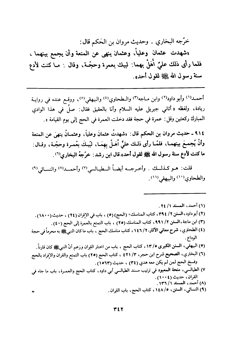 914 - حديث مروان بن الحكم قال: "شهدتُ عثمانَ وعليًا، وعثمانُ ينهىَ عن المتعة وأنْ يُجمعَ بينهما، فلما رأى ذلك عليٌّ أهَلَّ بِهِمَا، لبّيكَ بعُمرة وحجّة، وقال: ما كنت لأدع سنة رسول الله - صلى الله عليه وسلم - لقول أحد". قال ابن رشد: خرّجهُ البخاري.