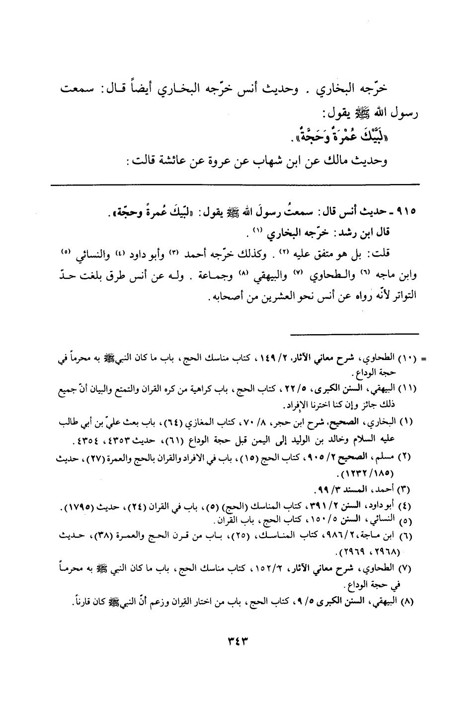 قلت: بل هو متفق عليه. وكذلك خرّجه أحمد وأبو داود والنسائي وابن ماجه والطحاوي والبيهقي وجماعة. وله عن أنس طرق بلغت حدّ التواتر لأنّه رواه عن أنس نحو العشرين من أصحابه.