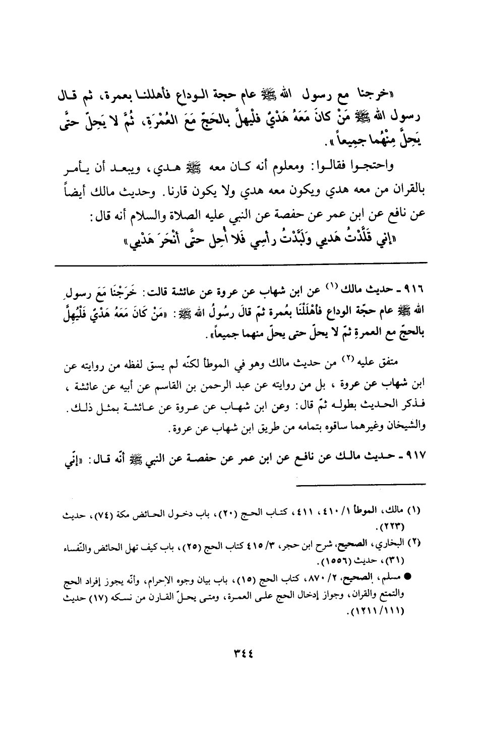 916 - حديث مالك عن ابن شهاب عن عروة عن عائشة قالت: خَرَجْنَا مَعَ رسولِ الله - صلى الله عليه وسلم - عام حجّة الوداع فأهْلَلْنَا بعُمرة ثمّ قالَ رسُولُ الله - صلى الله عليه وسلم -: "مَنْ كَانَ مَعَهُ هَدْيٌ فَلْيُهِلَّ بالحجّ مع العمرةِ ثمّ لا يحلّ حتى يحلّ منهما جميعًا".