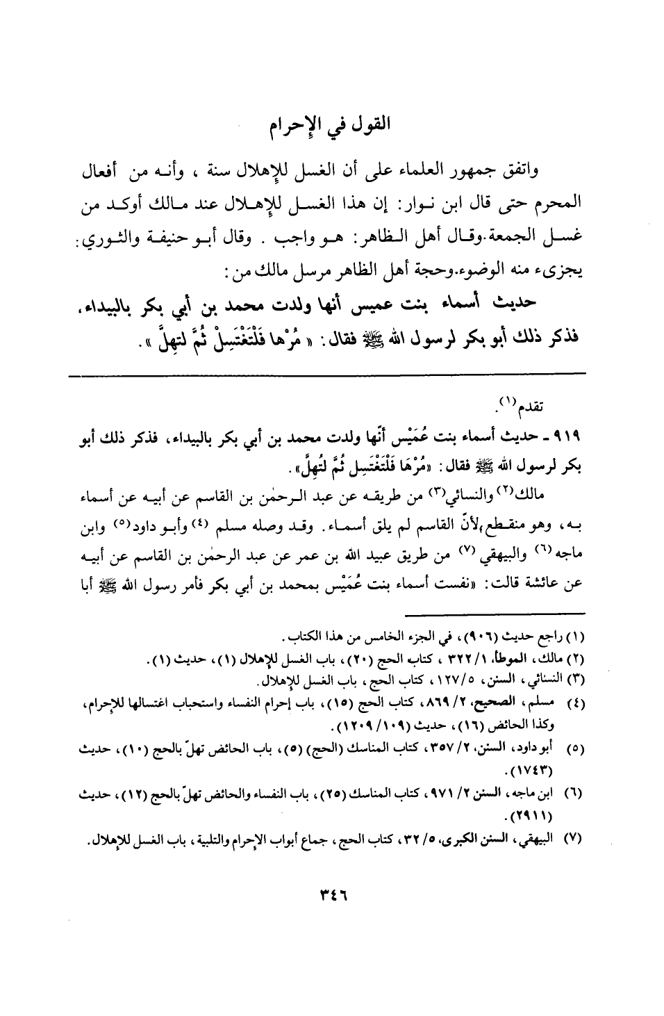 919 - حديث أسماء بنت عُمَيْس أنّها ولدت محمد بن أبي بكر بالبيداء، فذكر ذلك أبو بكر لرسول الله - صلى الله عليه وسلم - فقال: "مُرْهَا فَلْتَغْتَسِل ثُمَّ لتُهِلَّ".
