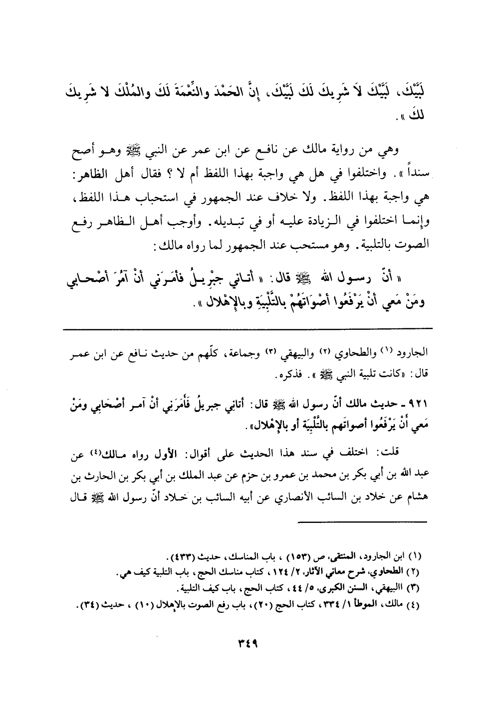 الجارود والطحاوي والبيهقي وجماعة، كلّهم من حديث نافع عن ابن عمر قال: "كانت تلبية النبي- صلى الله عليه وسلم -". فذكره.
