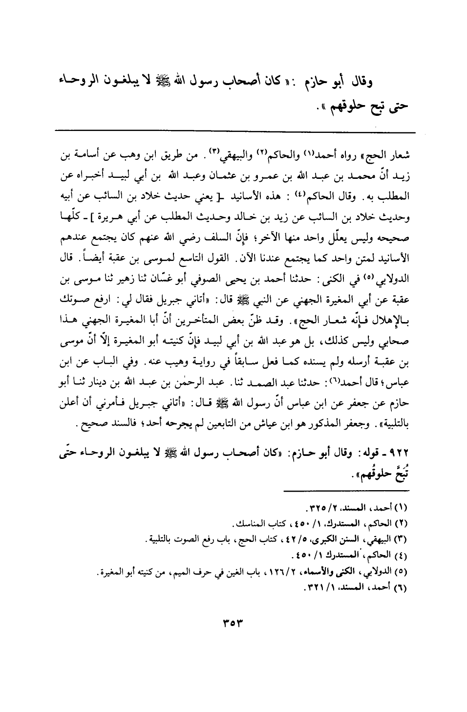 شعار الحج" رواه أحمد والحاكم والبيهقي. من طريق ابن وهب عن أسامة بن زيد أنَّ محمد بن عبد الله بن عمرو بن عثمان وعبد الله بن أبي لبيد أخبراه عن المطلب به. وقال الحاكم: هذه الأسانيد -[يعني حديث خلاد بن السائب عن أبيه وحديث خلاد بن السائب عن زيد بن خالد وحديث المطلب عن أبي هريرة]- كلّها صحيحه وليس يعلّل واحد منها الآخر؛ فإِنّ السلف -رضي الله عنهم- كان يجتمع عندهم الأسانيد لمتن واحد كما يجتمع عندنا الآن. القول التاسع لموسى بن عقبة أيضًا. قال الدولابي في الكنى: حدثنا أحمد بن يحيى الصوفي أبو غسّان ثنا زهير ثنا موسى بن عقبة عن أبي المغيرة الجهني عن النبي - صلى الله عليه وسلم - قال: "أتاني جبريل فقال لي: ارفع صوتك بالإِهلال فإِنّه شعار الحج". وقد ظنّ بعض المتأخرين أنّ أبا المغيرة الجهني هذا صحابي وليس كذلك، بل هو عبد الله بن أبي لبيد فإِنّ كنيته أبو المغيرة إلَّا أنَّ موسى بن عقبة أرسله ولم يسنده كما فعل سابقًا في رواية وهيب عنه. وفي الباب عن ابن عباس؛ قال أحمد: حدثنا عبد الصمد ثنا عبد الرحمن بن عبد الله بن دينار ثنا أبو حازم عن جعفر عن ابن عباس أنَّ رسول الله - صلى الله عليه وسلم - قال: "أتاني جبريل فأمرني أن أعلن بالتلبية". وجعفر المذكور هو ابن عياش من التابعين لم يجرحه أحد؛ فالسند صحيح.