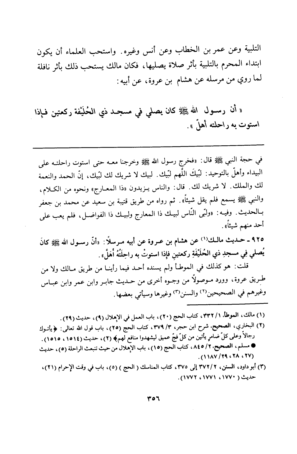 925 - حديث مالك عن هشام بن عروة عن أبيه مرسلًا: "أنّ رسول الله - صلى الله عليه وسلم - كانَ يُصلي فِي مسجدِ ذي الحُلَيْفَةِ ركعتينِ فإِذا استوتْ به راحِلَتُهُ أهَلَّ".