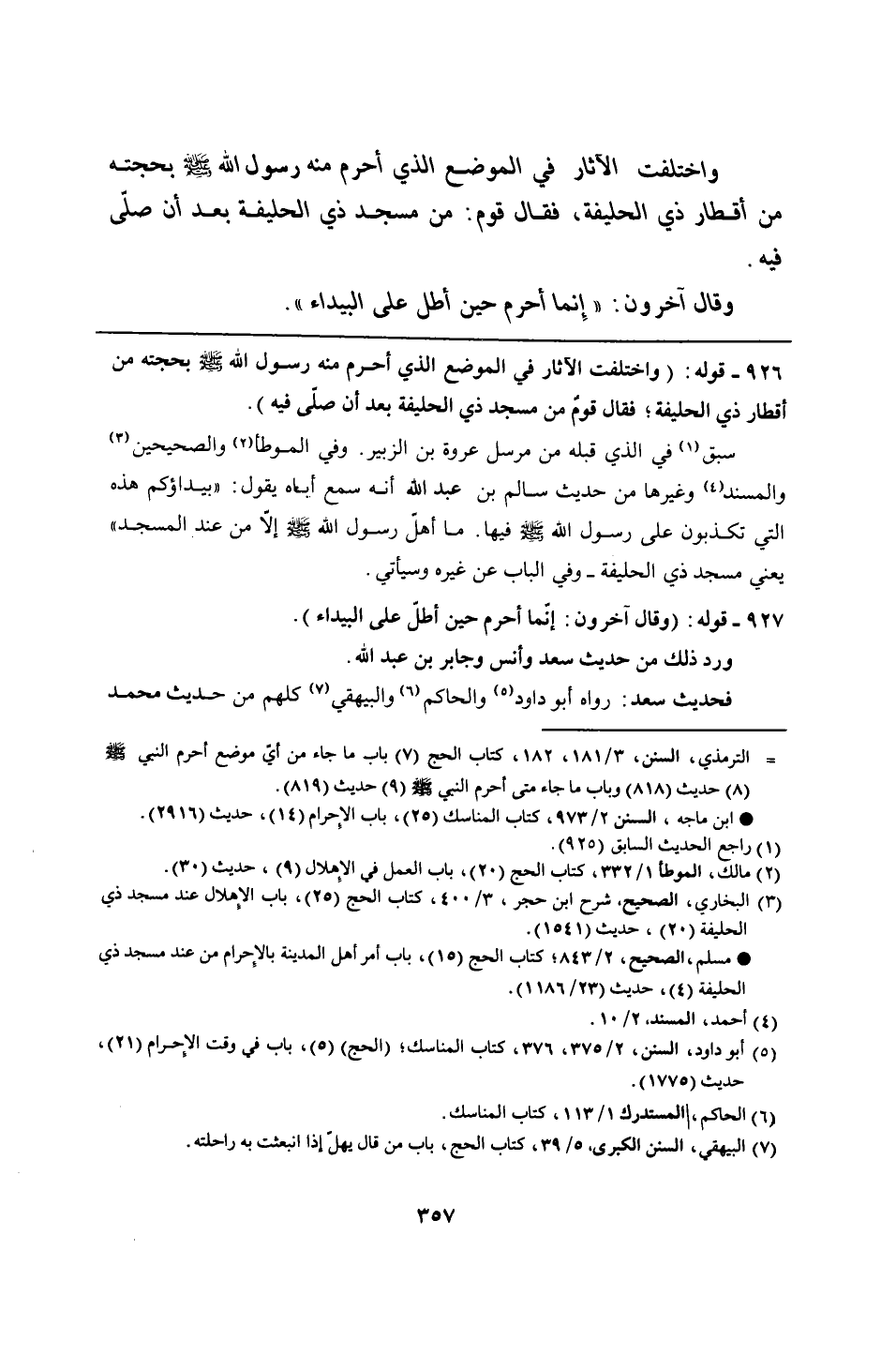 926 - قوله: (واختلفت الآثار في الموضع الذي أحرم منه رسول الله - صلى الله عليه وسلم - بحجته من أقطار ذي الحليفة؛ فقال قومٌ من مسجد ذي الحليفة بعد أن صلّى فيه).