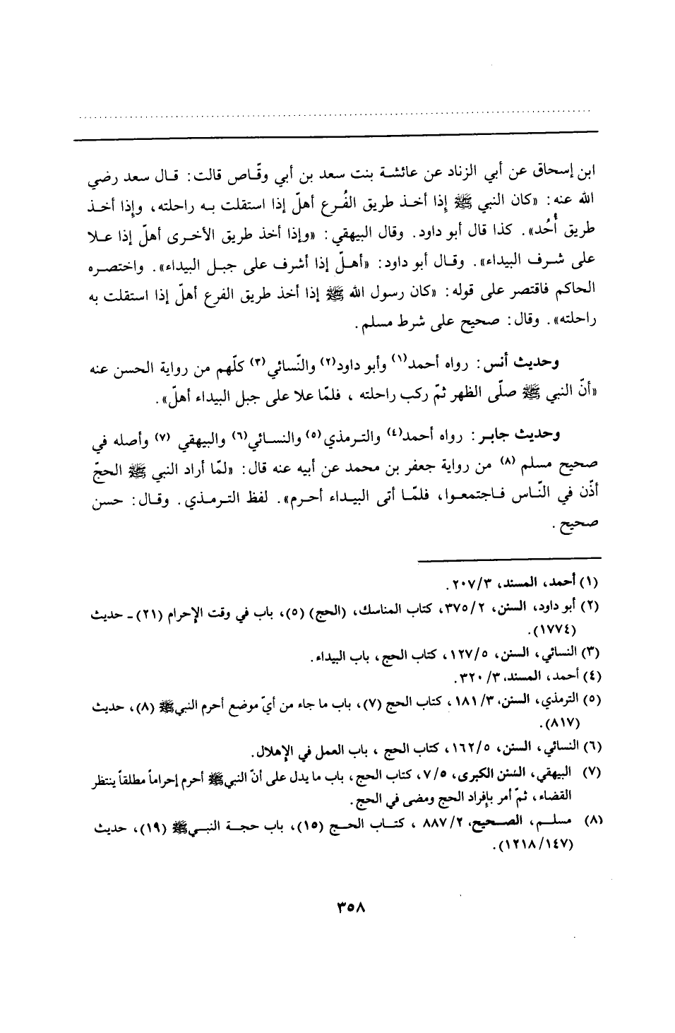 ابن إسحاق عن أبي الزناد عن عائشة بنت سعد بن أبي وقّاص قالت: قال سعد - رضي الله عنه -: "كان النبي - صلى الله عليه وسلم - إِذا أخذ طريق الفُرع أهلّ إذا استقلت به راحلته، وإِذا أخذ طريق أُحُد". كذا قال أبو داود. وقال البيهقي: "وإذا أخذ طريق الأخرى أهلّ إذا علا على شرف البيداء". وقال أبو داود: "أهلّ إذا أشرف على جبل البيداء". واختصره الحاكم فاقتصر على قوله: "كان رسول الله - صلى الله عليه وسلم - إذا أخذ طريق الفرع أهلّ إذا استقلت به راحلته". وقال: صحيح على شرط مسلم.