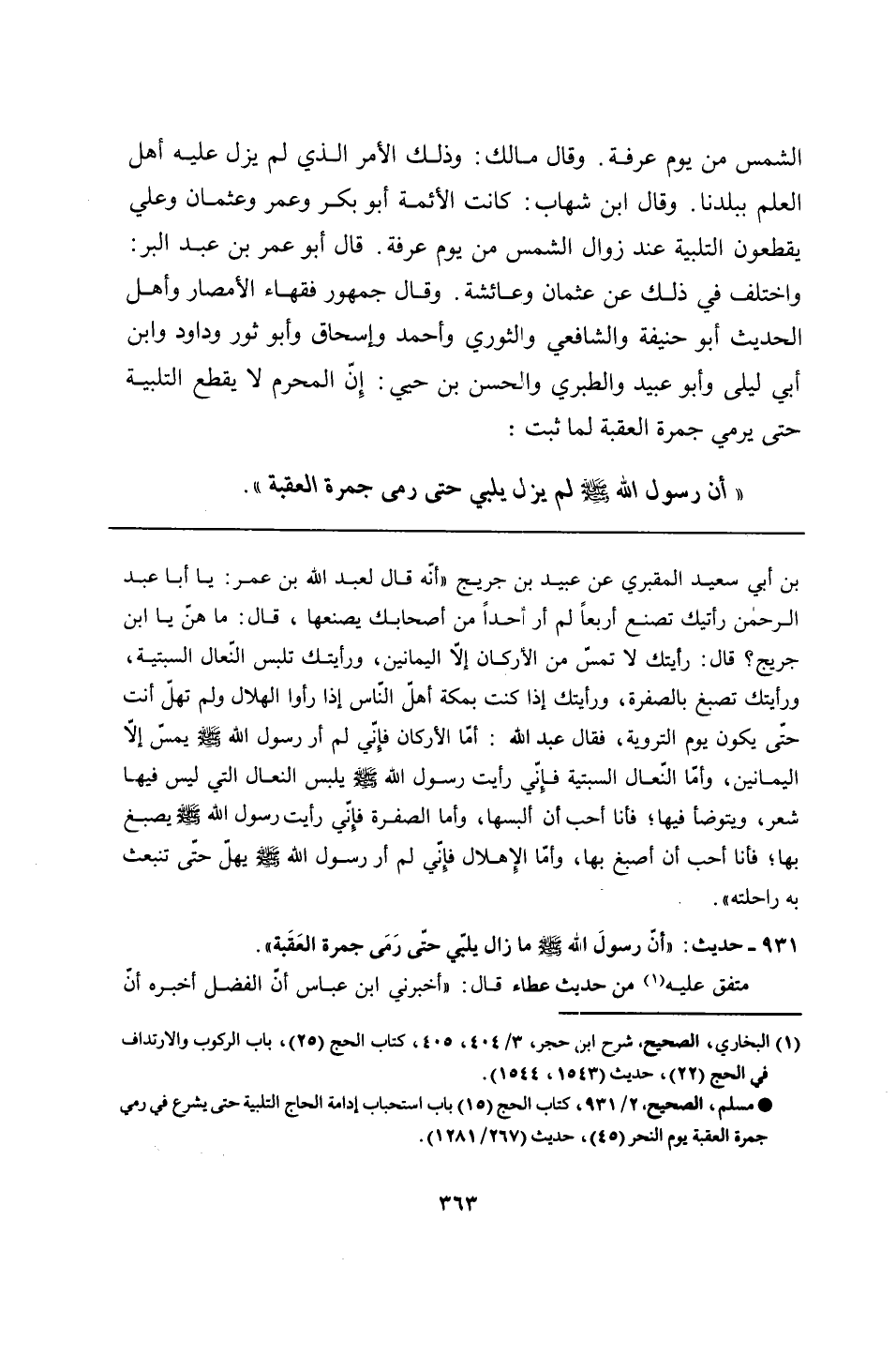 931 - حديث: "أن رسولَ الله - صلى الله عليه وسلم - ما زال يلبّي حتى رَمَى جمرة العَقَبة".