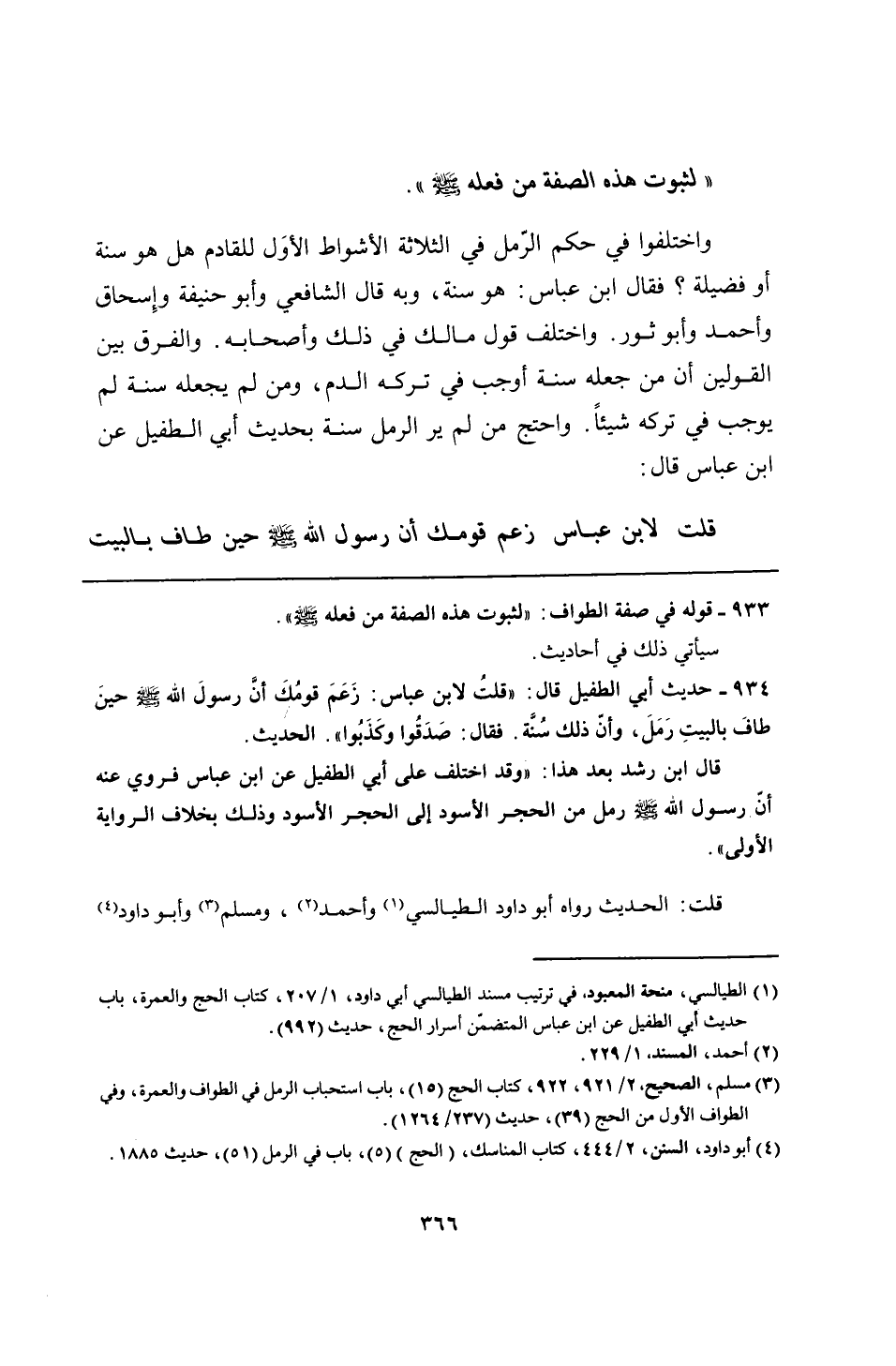 قال ابن رشد بعد هذا: "وقد اختلف على أبي الطفيل عن ابن عباس فروي عنه أنَّ رسول الله - صلى الله عليه وسلم - رمل من الحجر الأسود إلى الحجر الأسود وذلك بخلاف الرواية الأولى".
