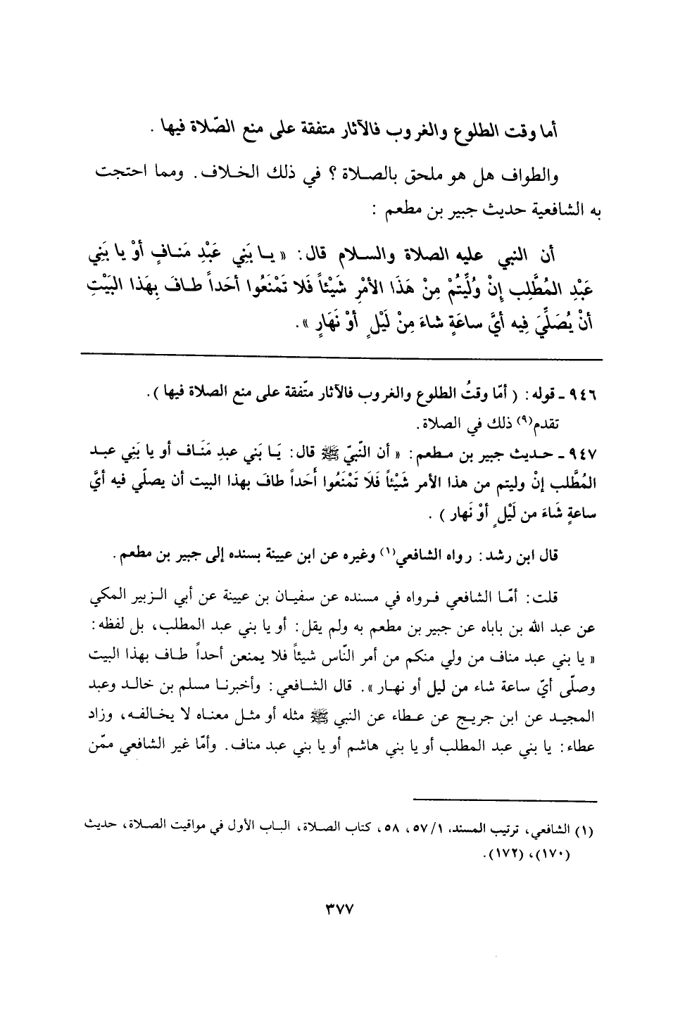 947 - حديث جبير بن مطعم: "أن النّبيّ - صلى الله عليه وسلم - قال: يَا بَني عبدِ مَنَاف أو يا بَنِي عبد المُطَّلب إنْ وليتم من هذا الأمر شَيْئًا فَلَا تَمْنَعُوا أحَدًا طافَ بهذا البيت أن يصلّي فيه أيَّ ساعةٍ شَاءَ من لَيْلٍ أوْ نَهار).