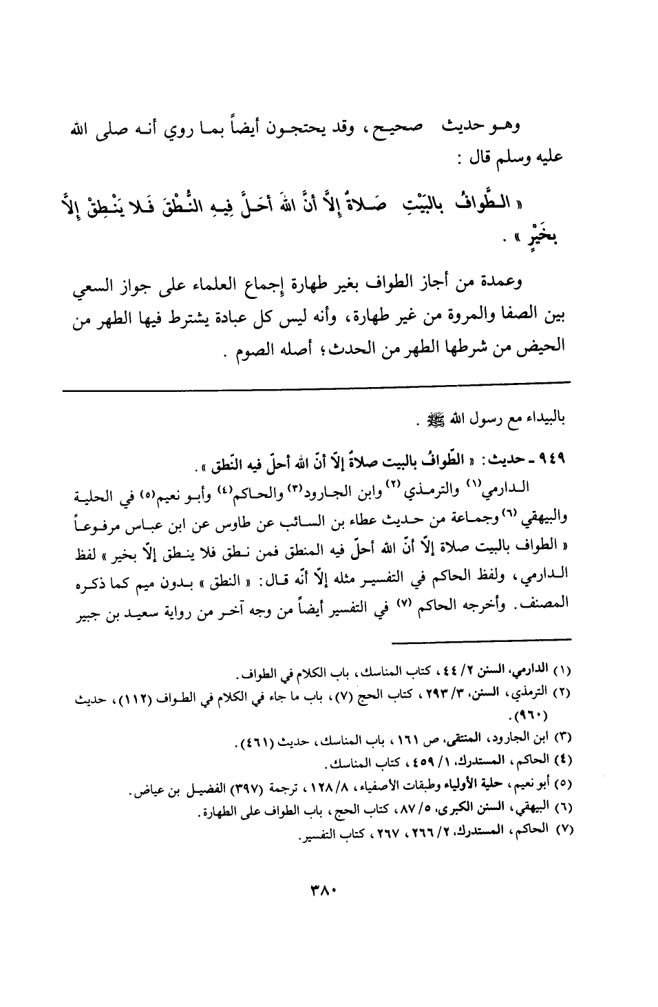 949 - حديث: "الطّوافُ بالبيت صلاةٌ إلّا أنّ الله أحلّ فيه النّطق".