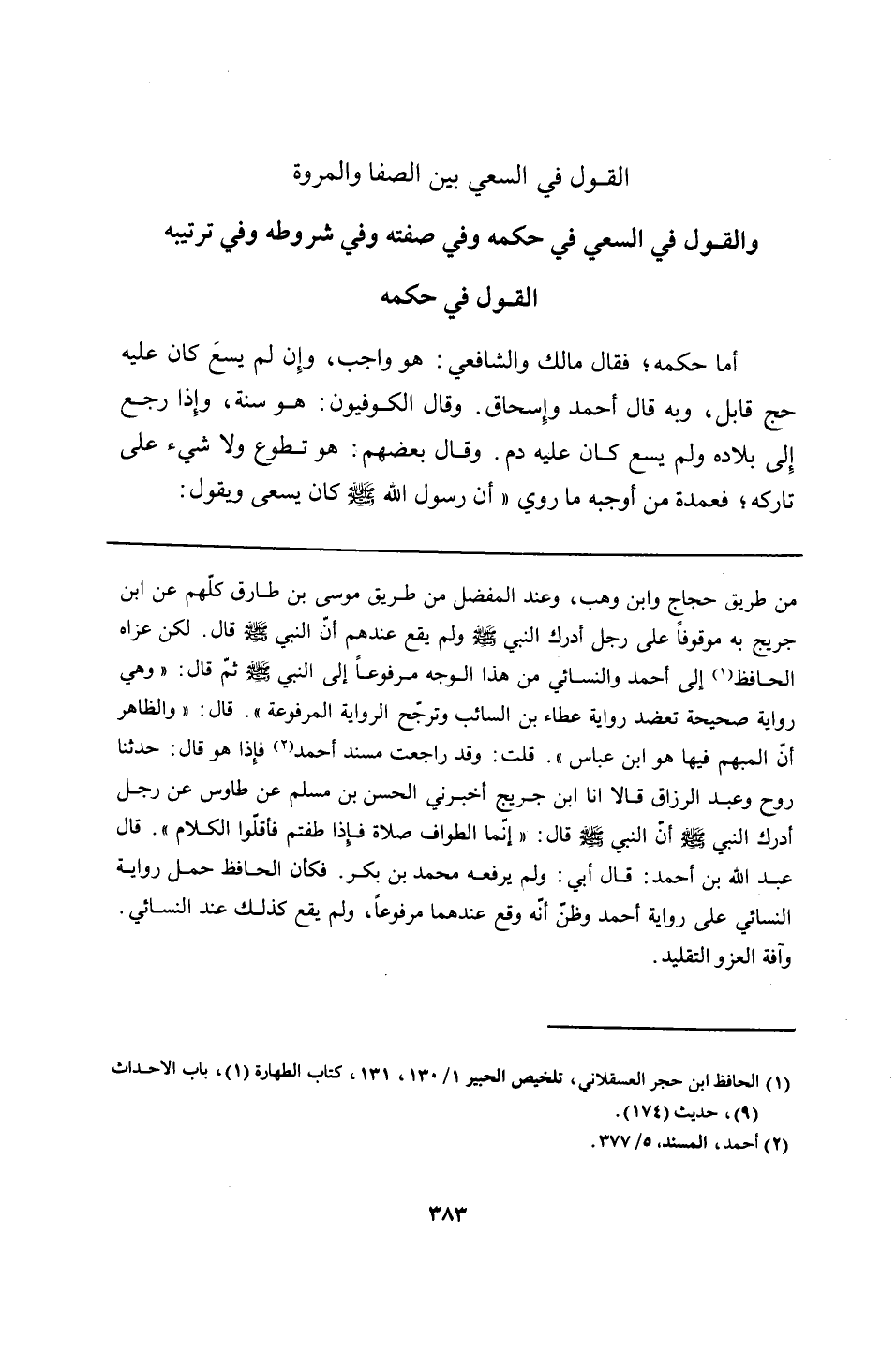 من طريق حجاج وابن وهب، وعند المفضل من طريق موسى بن طارق كلّهم عن ابن جريج به موقوفًا على رجل أدرك النبي - صلى الله عليه وسلم - ولم يقع عندهم أنّ النبي - صلى الله عليه وسلم - قال. لكن عزاه الحافظ إلى أحمد والنسائي من هذا الوجه مرفوعًا إلى النبي - صلى الله عليه وسلم - ثمّ قال: "وهي رواية صحيحة تعضد رواية عطاء بن السائب وترجّح الرواية المرفوعة". قال: "والظاهر أنّ المبهم فيها هو ابن عباس". قلت: وقد راجعت مسند أحمد فإِذا هو قال: حدثنا روح وعبد الرزاق قالا أنا ابن جريج أخبرني الحسن بن مسلم عن طاوس عن رجل أدرك النبي - صلى الله عليه وسلم - أنّ النبي- صلى الله عليه وسلم - قال: "إنّما الطواف صلاة فإذا طفتم فأقلوا الكلام". قال عبد الله بن أحمد: قال أبي: ولم يرفعه محمد بن بكر. فكأن الحافظ حمل رواية النسائي على رواية أحمد وظنّ أنّه وقع عندهما مرفوعًا، ولم يقع كذلك عند النسائي. وآفة العزو التقليد.