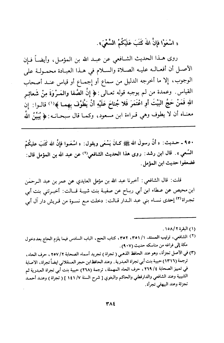 950 - حديث: "أنّ رسولَ الله - صلى الله عليه وسلم - كانَ يَسْعَى ويقول: "اسْعَوا فإِنَّ الله كَتَبَ عليكُمْ السّعي". قال ابن رشد: روى هذا الحديث الشافعي عن عبد الله بن المؤمل قال: فضعفوا حديث ابن المؤمل.