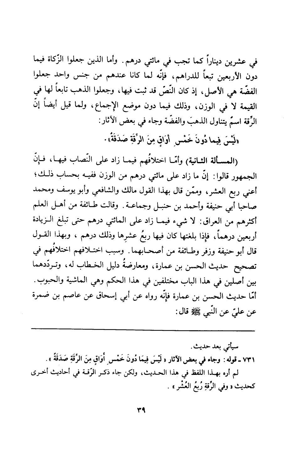 731 - قوله: وجاء في بعض الآثار "لَيْسَ فِيمَا دُونَ خَمْسِ أوَاقٍ مِنَ الرِّقَةِ صَدَقَةٌ".