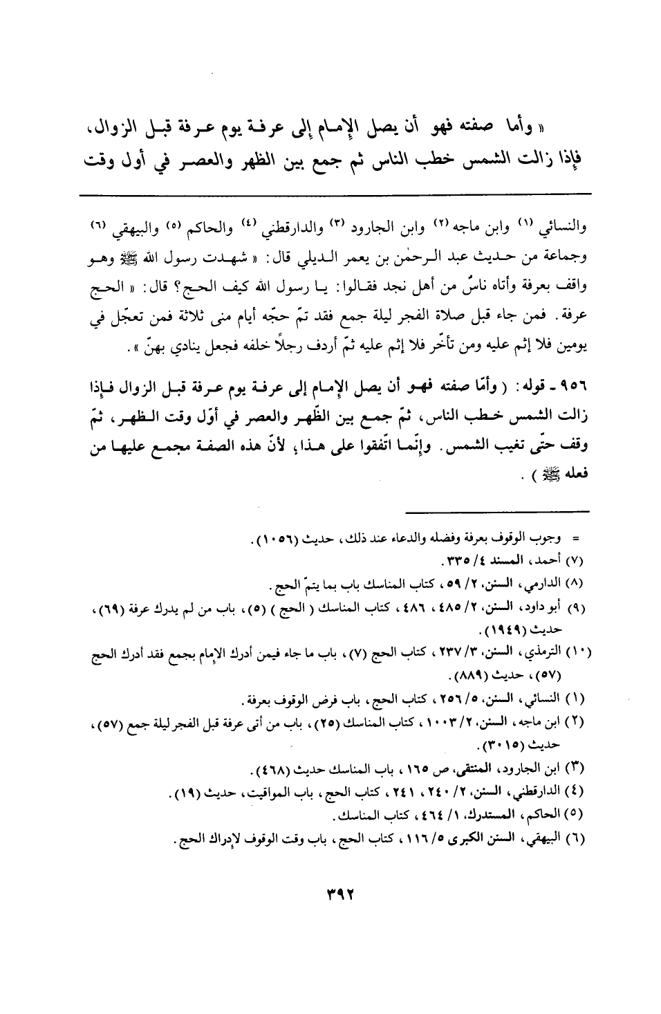 956 - قوله: (وأمّا صفته فهو أن يصل الإِمام إلى عرفة يوم عرفة قبل الزوال فإِذا زالت الشمس خطب الناس، ثمّ جمع بين الظهر والعصر في أوّل وقت الظهر، ثمّ وقف حتّى تغيب الشمس. وإِنّما اتّفقوا على هذا؛ لأنّ هذه الصفة مجمع عليها من فعله - صلى الله عليه وسلم -).