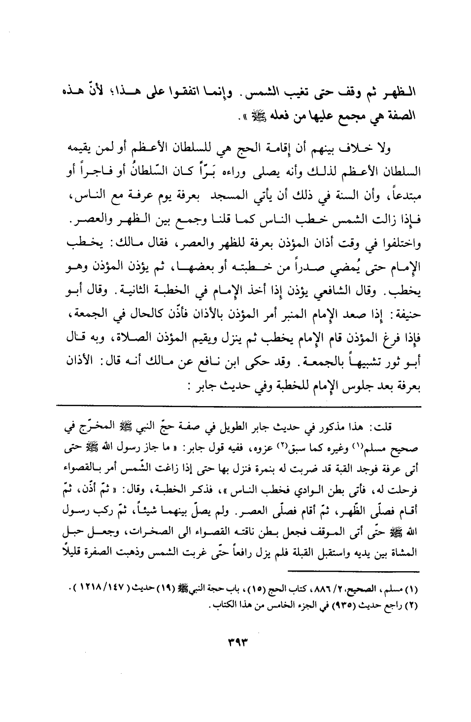 قلت: هذا مذكور في حديث جابر الطويل في صفة حجّ النبي - صلى الله عليه وسلم - المخرّج في صحيح مسلم وغيره كما سبق عزوه، ففيه قول جابر: "ما جاز رسول الله - صلى الله عليه وسلم - حتى أتى عرفة فوجد القبة قد ضربت له بنمرة فنزل بها حتى إذا زاغت الشّمس أمر بالقصواء فرحلت له، فأتى بطن الوادي فخطب الناس"، فذكر الخطبة، وقال: "ثمّ أذّن, ثمّ أقام فصلّى الظّهر، ثمّ أقام فصلّى العصر. ولم يصلّ بينهما شيئًا، ثمّ ركب رسول الله - صلى الله عليه وسلم - حتى أتى الموقف فجعل بطن ناقته القصواء الى الصخرات، وجعل حبل المشاة بين يديه واستقبل القبلة فلم يزل رافعًا حتى غربت الشمس وذهبت الصفرة قليلًا