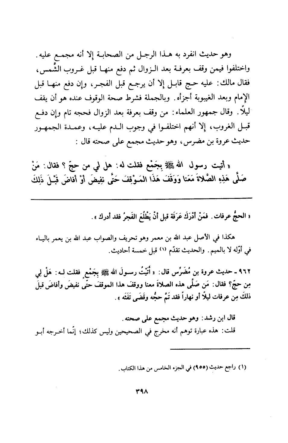 962 - حديث عروة بن مُضَرِّس قال: "أتَيْتُ رسولَ الله - صلى الله عليه وسلم - بِجَمْعٍ فقلت له: هَلْ لِي مِن حجّ؟ فقال: مَن صَلَّى هذه الصلاةَ معنا ووقفَ هذا الموقفَ حتى نفيضَ وأفاضَ قبلَ ذلكَ مِن عرفات ليلًا أو نهارًا فقد تَمَّ حجُّه وقَضَى تَفَثَه".