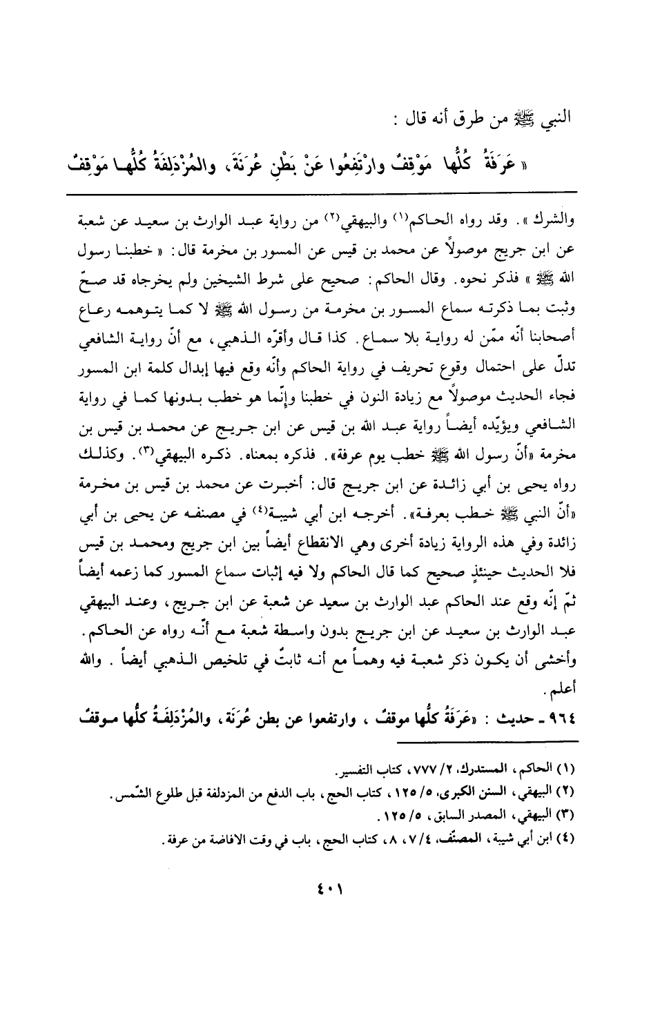 والشرك". وقد رواه الحاكم والبيهقي من رواية عبد الوارث بن سعيد عن شعبة عن ابن جريج موصولًا عن محمد بن قيس عن المسور بن مخرمة قال: "خطبنا رسول الله - صلى الله عليه وسلم -" فذكر نحوه. وقال الحاكم: صحيح على شرط الشيخين ولم يخرجاه قد صحّ وثبت بما ذكرته سماع المسور بن مخرمة من رسول الله - صلى الله عليه وسلم - لا كما يتوهمه رعاع أصحابنا أنّه ممّن له رواية بلا سماع. كذا قال وأقرّه الذهبي، مع أنّ رواية الشافعي تدلّ على احتمال وقوع تحريف في رواية الحاكم وأنّه وقع فيها إبدال كلمة ابن المسور فجاء الحديث موصولًا مع زيادة النون في خطبنا وإِنّما هو خطب بدونها كما في رواية الشافعي ويؤيّده أيضًا رواية عبد الله بن قيس عن ابن جريج عن محمد بن قيس بن مخرمة "أنّ رسول الله - صلى الله عليه وسلم - خطب يوم عرفة". فذكره بمعناه. ذكره البيهقي. وكذلك رواه يحيى بن أبي زائدة عن ابن جريج قال: أخبرت عن محمد بن قيس بن مخرمة "أنّ النبي - صلى الله عليه وسلم - خطب بعرفة". أخرجه ابن أبي شيبة في مصنفه عن يحيى بن أبي زائدة وفي هذه الرواية زيادة أخرى وهي الانقطاع أيضًا بين ابن جريج ومحمد بن قيس فلا الحديث حينئذٍ صحيح كما قال الحاكم ولا فيه إثبات سماع المسور كما زعمه أيضًا ثمّ إنّه وقع عند الحاكم عبد الوارث بن سعيد عن شعبة عن ابن جريج، وعند البيهقي عبد الوارث بن سعيد عن ابن جريج بدون واسطة شعبة مع أنّه رواه عن الحاكم. وأخشى أن يكون ذكر شعبة فيه وهمًا مع أنه ثابتٌ في تلخيص الذهبي أيضًا. والله أعلم.