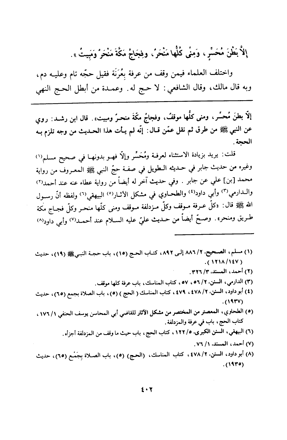 إلّا بطنَ مُحسِّر، ومنى كلُّها موقفٌ، وفجاجُ مكّةَ منحرٌ ومبيت". قال ابن رشد: روي عن النبي - صلى الله عليه وسلم - من طرق ثم نقل عمّن قال: إنّه لم يأت هذا الحديث من وجه تلزم به الحجة.