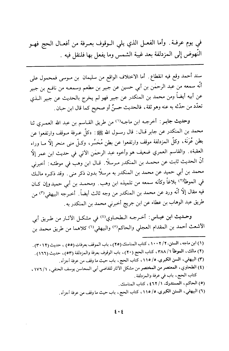وحديث جابر: أخرجه ابن ماجه من طريق القاسم بن عبد الله العمري ثنا محمد بن المنكدر عن جابر قال: قال رسول الله - صلى الله عليه وسلم -: "كلّ عرفة موقف وارتفعوا عن بطن عُرَنَة، وكلّ المزدلفة موقف وارتفعوا عن بطن مُحَسِّر، وكلّ منى منحر إلّا ما وراء العقبة". والقاسم العمري ضعيف هو وأخوه عبد الرحمن الآتي في حديث ابن عمر إلّا أنّ الحديث ثابت عن محمد بن المنكدر مرسلًا. قال ابن وهب في موطئه: أخبرني محمد بن أبي حميد عن محمد بن المنكدر به مرسلًا بدون ذكر منى. وقد ذكره مالك في الموطأ بلاغًا وكأنه سمعه من تلميذه ابن وهب. ومحمد بن أبي حميد وإن كان فيه مقال إلّا أنّه ورد عن محمد بن المنكدر من وجه ثالث أيضًا. أخرجه البيهقي من طريق عبد الوهاب بن عطاء عن ابن جريج أخبرني محمد بن المنكدر به.