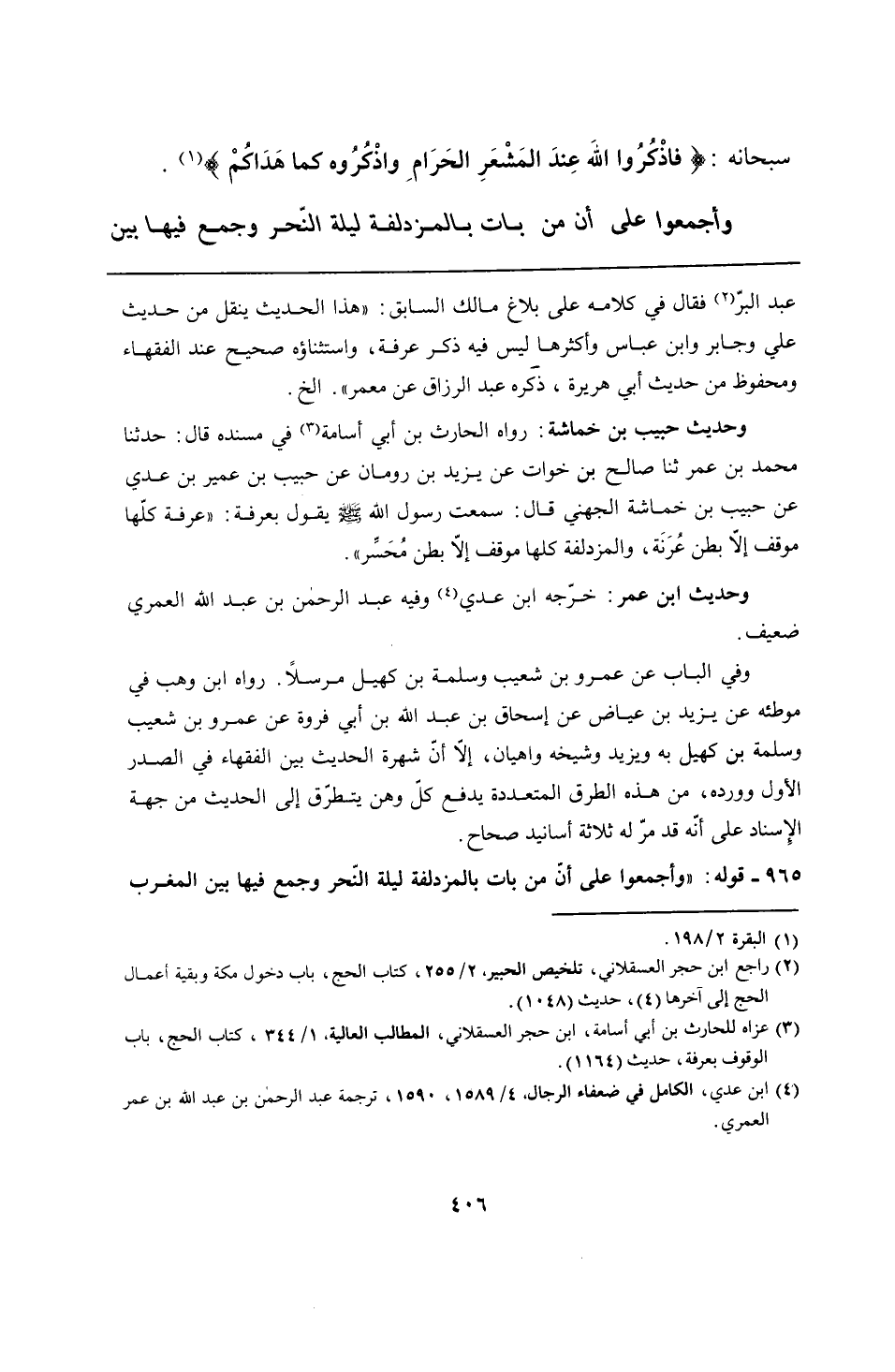965 - قوله: "وأجمعوا على أنّ من بات بالمزدلفة ليلة النّحر وجمع فيها بين المغرب