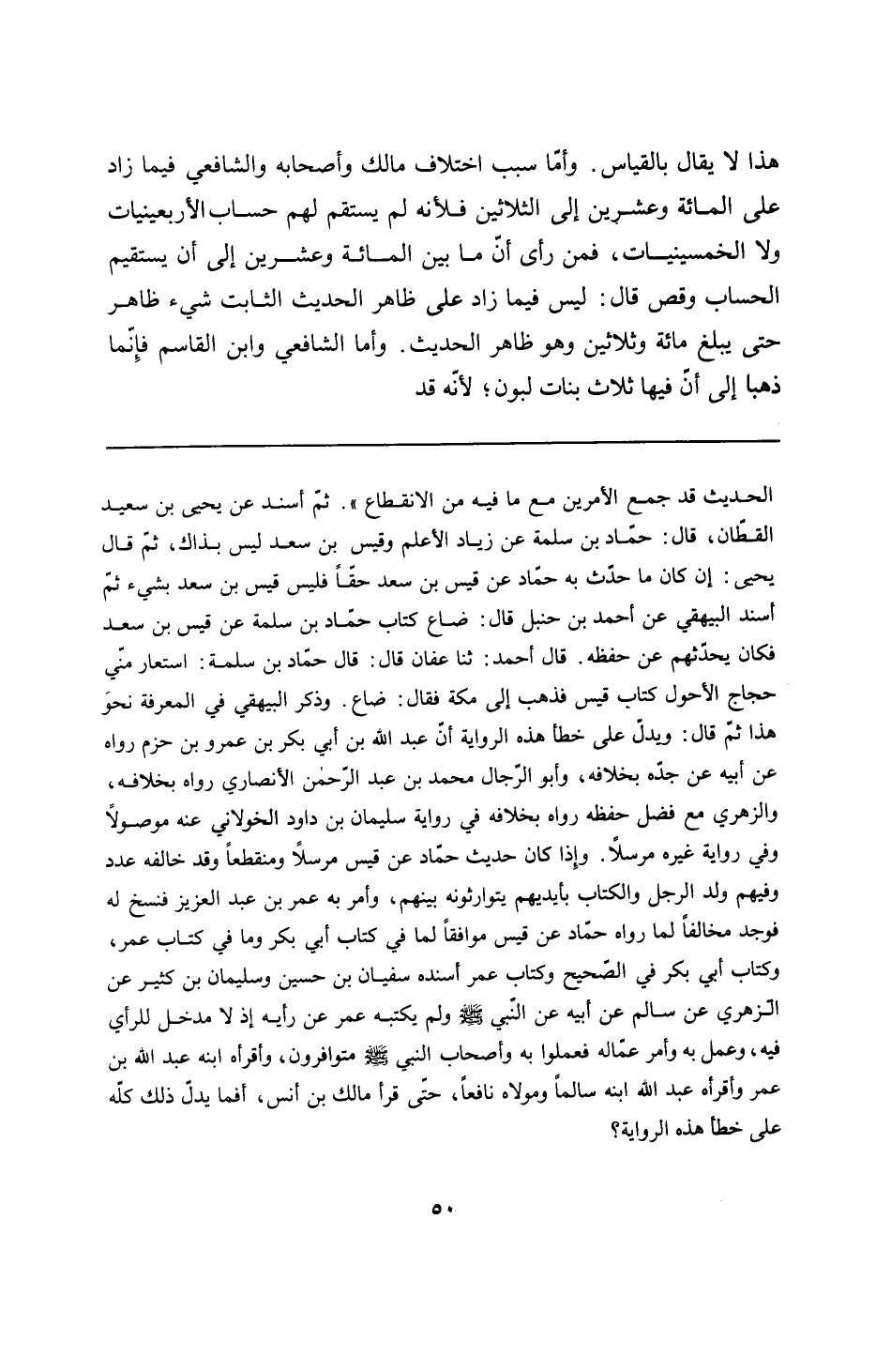الحديث قد جمع الأمرين مع ما فيه من الانقطاع". ثمّ أسند عن يحيى بن سعيد القطّان، قال: حماد بن سلمة عن زياد الأعلم وقيس بن سعد ليس بذاك، ثمّ قال يحيى: إن كان ما حدّث به حماد عن قيس بن سعد حقًا فليس قيس بن سعد بشيء ثمّ أسند البيهقي عن أحمد بن حنبل قال: ضاع كتاب حماد بن سلمة عن قيس بن سعد فكان يحدثهم عن حفظه. قال أحمد: ثنا عفان قال: قال حماد بن سلمة: استعار منّي حجاج الأحول كتاب قيس فذهب إلى مكة فقال: ضاع. وذكر البيهقي في المعرفة نحوَ هذا ثمّ قال: ويدّل على خطأ هذه الرواية أنّ عبد الله بن أبي بكر بن عمرو بن حزم رواه عن أبيه عن جدّه بخلافه، وأبو الرجال محمَّد بن عبد الرحمن الأنصاري رواه بخلافه، والزهري مع فضل حفظه رواه بخلافه في رواية سليمان بن داود الخولاني عنه موصولًا وفي رواية غيره مرسلًا. وإِذا كان حديث حمّاد عن قيس مرسلًا ومنقطعًا وقد خالفه عدد وفيهم ولد الرجل والكتاب بأيديهم يتوارثونه بينهم، وأمر به عمر بن عبد العزيز فنسخ له فوجد مخالفًا لما رواه حماد عن قيس موافقًا لما في كتاب أبي بكر وما في كتاب عمر، وكتاب أبي بكر في الصحيح وكتاب عمر أسنده سفيان بن حسين وسليمان بن كثير عن الزهريّ عن سالم عن أبيه عن النّبي - صلى الله عليه وسلم - ولم يكتبه عمر عن رأيه إذ لا مدخل للرأي فيه، وعمل به وأمر عماله فعملوا به وأصحاب النبي - صلى الله عليه وسلم - متوافرون، وأقرأه ابنه عبد الله بن عمر وأقرأه عبد الله ابنه سالمًا ومولاه نافعًا، حتى قرأ مالك بن أنس، أفما يدلّ ذلك كلّه على خطأ هذه الرواية؟