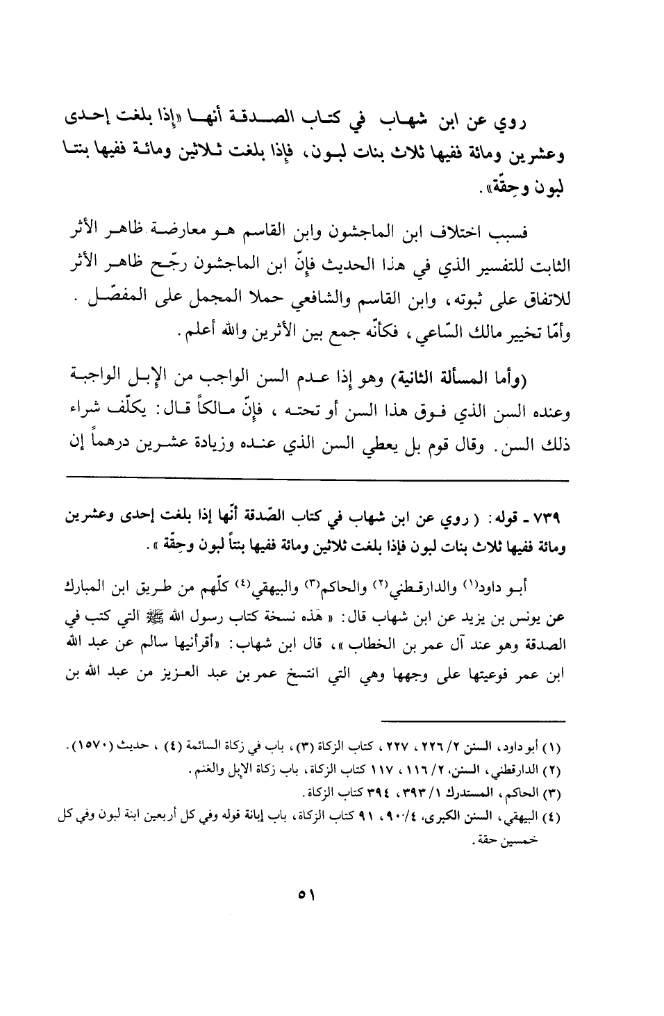 739 - قوله: (روي عن ابن شهاب في كتاب الصّدقة أنّها إذا بلغت إحدى وعشرين ومائة ففيها ثلاث بنات لبون فإذا بلغت ثلاثين ومائة ففيها بنتًا لبون وحِقّة".