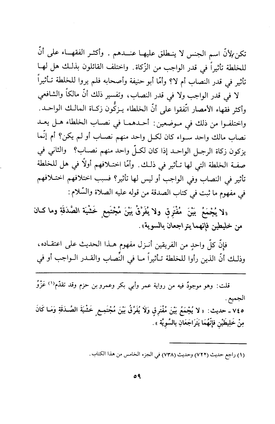 745 - حديث: "لا يُجْمَعُ بَيْنَ مُفْتَرِقٍ وَلَا يفَرقُ بَيْنَ مُجْتَمِعٍ خَشْيَةَ الصدقَةِ وَمَا كَانَ مِنْ خَلِيطَيْنِ فإِنّهُمَا يَتَرَاجَعَانِ بالسَّوِيَّة".