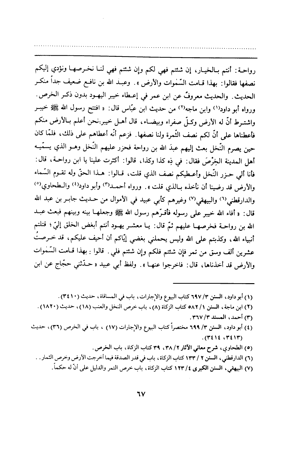 رواحة: أنتم بالخيار، إن شئتم فهي لكم وإن شئتم فهي لنا نخرصها ونؤدي إليكم نصفها فقالوا: بهذا قامت السموات والأرض". وعبد الله بن نافع ضعيف جدًا منكر الحديث. والحديث معروفٌ عن ابن عمر في إعطاء خيبر اليهود بدون ذكر الخرص. ورواه أبو داود وابن ماجه من حديث ابن عباس قال: "افتتح رسول الله - صلى الله عليه وسلم - خيبر واشترط أنّ له الأرض وكل صفراء وبيضاء، قال أهل خيبر: نحن أعلم بالأرض منكم فأعطناها على أن لكم نصف الثمرة ولنا نصفها. فزعم أنه أعطاهم على ذلك، فلمّا كان حين يصرم النّخل بعث إليهم عبدَ الله بن رواحة فحزر عليهم النخل وهو الذي يسمّيه أهل المدينة الخِرْصَ فقال: في هذه كذا وكذا، قالوا: أكثرت علينا يا ابن رواحة، قال: فأنا ألي حزر النخل وأعطيكم نصف الذي قلت، قالوا: هذا الحق وله تقوم السماء والأرض قد رضينا أن نأخذه بالذي قلت". ورواه أحمد وأبو داود والطحاوي والدارقطني والبيهقي وغيرهم كأبي عبيد في الأموال من حديث جابر بن عبد الله قال: "أفاء الله خيبر على رسوله فأقرّهم رسول الله - صلى الله عليه وسلم - وجعلها بينه وبينهم فبعث عبد الله بن رواحة فخرصها عليهم ثمّ قال: يا معشر يهود أنتم أبغض الخلق إليّ؛ قتلتم أنبياء الله، وكذبتم على الله وليس يحملني بغضي إيّاكم أن أحيف عليكم، قد خرصتُ عشرين ألف وسق من تمر فإن شئتم فلكم وإن شئتم فلي. قالوا: بهذا قامت السموات والأرض قد أخذناها، قال: فاخرجوا عنها". ولفظ أبي عبيد "حدّثني حجّاج عن ابن