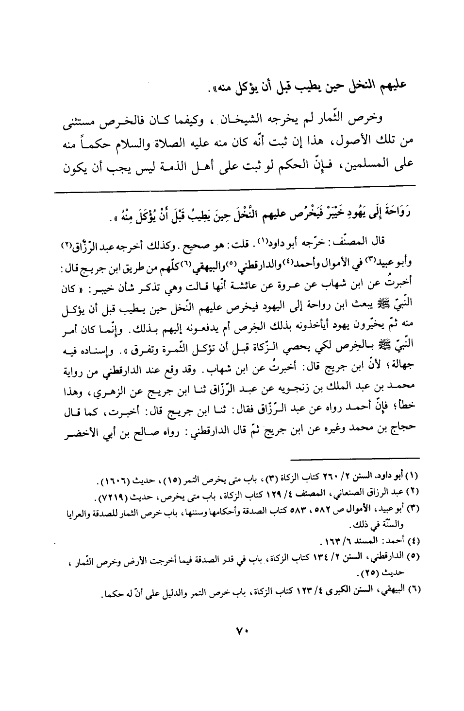 قال المصنّف: خرّجه أبو داود. قلت: هو صحيح. وكذلك أخرجه عبد الرزاق وأبو عبيد في الأموال وأحمد والدارقطني والبيهقي كلهم من طريق ابن جريج قال: أخبرتُ عن ابن شهاب عن عروة عن عائشة أنها قالت وهي تذكر شأن خيبر: "كان النبي - صلى الله عليه وسلم - يبعث ابن رواحة إلى اليهود فيخرص عليهم النْخل حين يطيب قبل أن يؤكل منه ثمّ يخيّرون يهود أيأخذونه بذلك الخِرص أم يدفعونه إليهم بذلك. وإِنّما كان أمر النبي - صلى الله عليه وسلم - بالخِرص لكي يحصي الزكاة قبل أن تؤكل الثمرة وتفرق". وإِسناده فيه جهالة؛ لأن ابن جريج قال: أخبرتُ عن ابن شهاب. وقد وقع عند الدارقطني من رواية محمد بن عبد الملك بن زنجويه عن عبد الرزاق ثنا ابن جريج عن الزهريّ، وهذا خطأ؛ فإنّ أحمد رواه عن عبد الرزاق فقال: ثنا ابن جريج قال: أخبرت، كما قال حجاج بن محمَّد وغيره عن ابن جريج ثمّ قال الدارقطني: رواه صالح بن أبي الأخضر