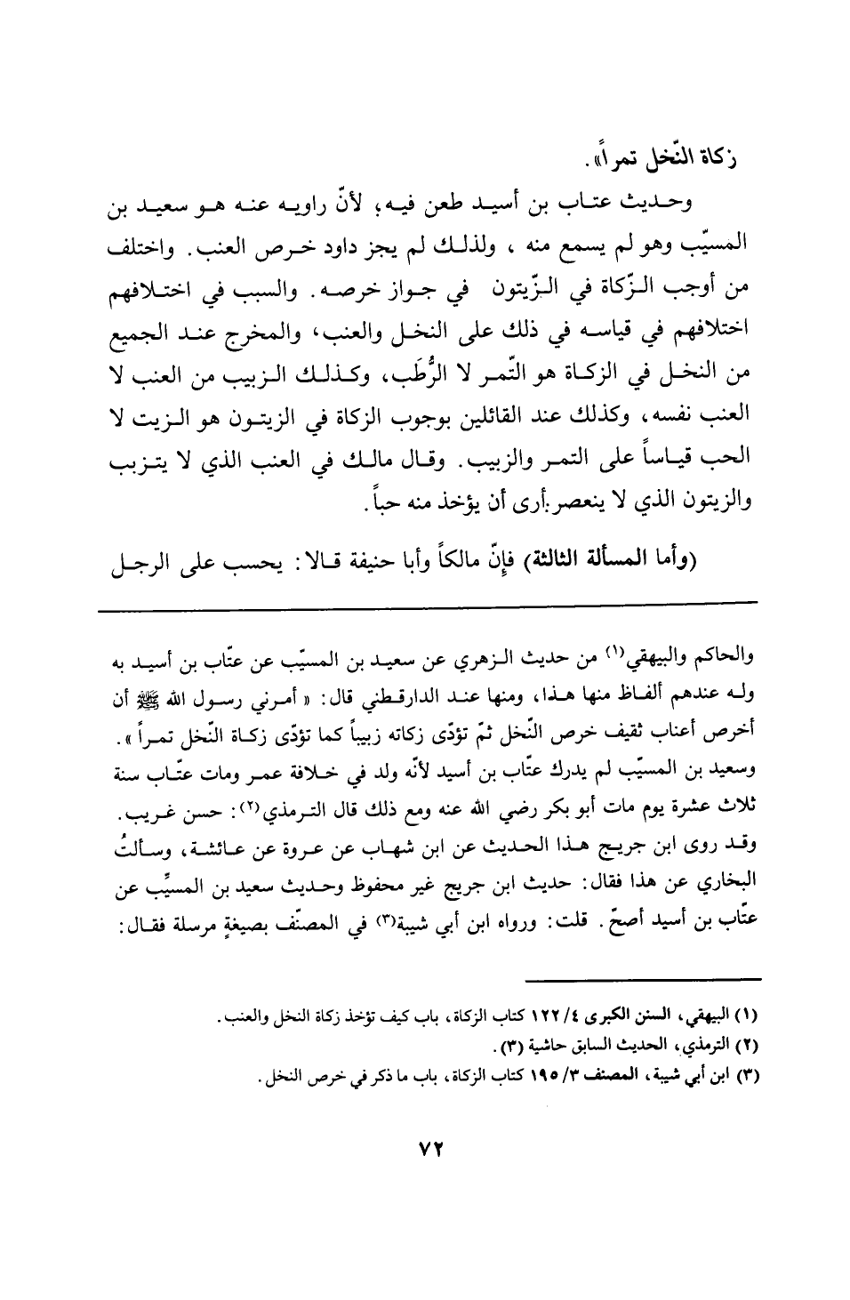 والحاكم والبيهقي من حديث الزهري عن سعيد بن المسيب عن عتاب بن أسيد به وله عندهم ألفاظ منها هذا، ومنها عند الدارقطني قال: "أمرني رسول الله - صلى الله عليه وسلم - أن أخرص أعناب ثقيف خرص النخل ثمّ تؤدّى زكاته زبيبًا كما تؤدى زكاة النخل تمرًا". وسعيد بن المسيب لم يدرك عتاب بن أسيد لأنه ولد في خلافة عمر ومات عتّاب سنة ثلاث عشرة يوم مات أبو بكر - رضي الله عنه - ومع ذلك قال الترمذي: حسن غريب. وقد روى ابن جريج هذا الحديث عن ابن شهاب عن عروة عن عائشة، وسألتُ البخاري عن هذا فقال: حديث ابن جريج غير محفوظ وحديث سعيد بن المسيب عن عتاب بن أسيد أصحّ. قلت: ورواه ابن أبي شيبة في المصنف بصيغةٍ مرسلة فقال:
