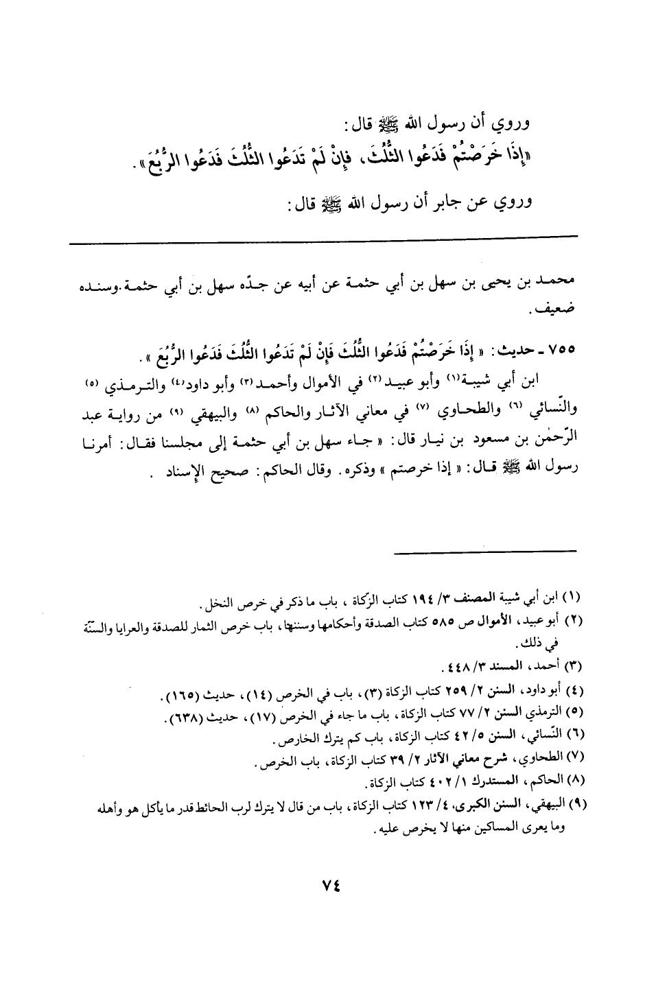 ابن أبي شيبة وأبو عبيد في الأموال وأحمد وأبو داود والترمذي والنسائي والطحاوي في معاني الآثار والحاكم والبيهقي من رواية عبد الرحمن بن مسعود بن نيار قال: "جاء سهل بن أبي حثمة إلى مجلسنا فقال: أمرنا رسول الله - صلى الله عليه وسلم - قال: "إذا خرصتم" وذكره. وقال الحاكم: صحيح الإِسناد.