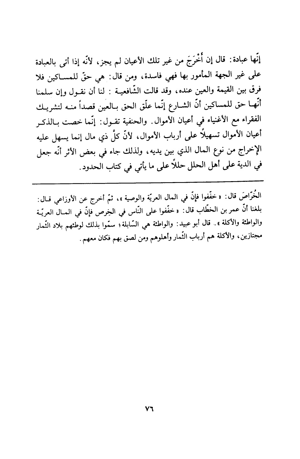 الخُرّاصَ قال: "خفّفوا فإن في المال العريّة والوصية"، ثمّ أخرج عن الأوزاعي قال: بلغنا أن عمر بن الخطاب قال: "خففوا على النّاس في الخِرص فإِن في المال العريّة والواطئة والأكلة". قال أبو عبيد: والواطئة هي السْابلة؛ سموا بذلك لوطئهم بلاد الثّمار مجتازين، والأكلة هم أرباب الثمار وأهلوهم ومن لصق بهم فكان معهم.