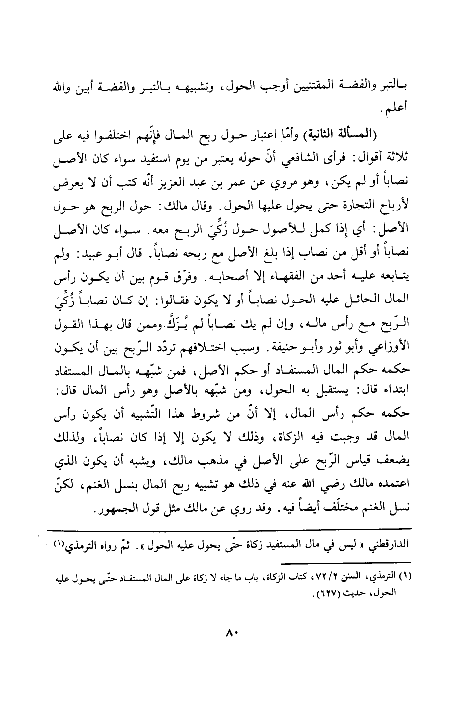 الدارقطني "ليس في مال المستفيد زكاة حتى يحول عليه الحول". ثمّ رواه الترمذي