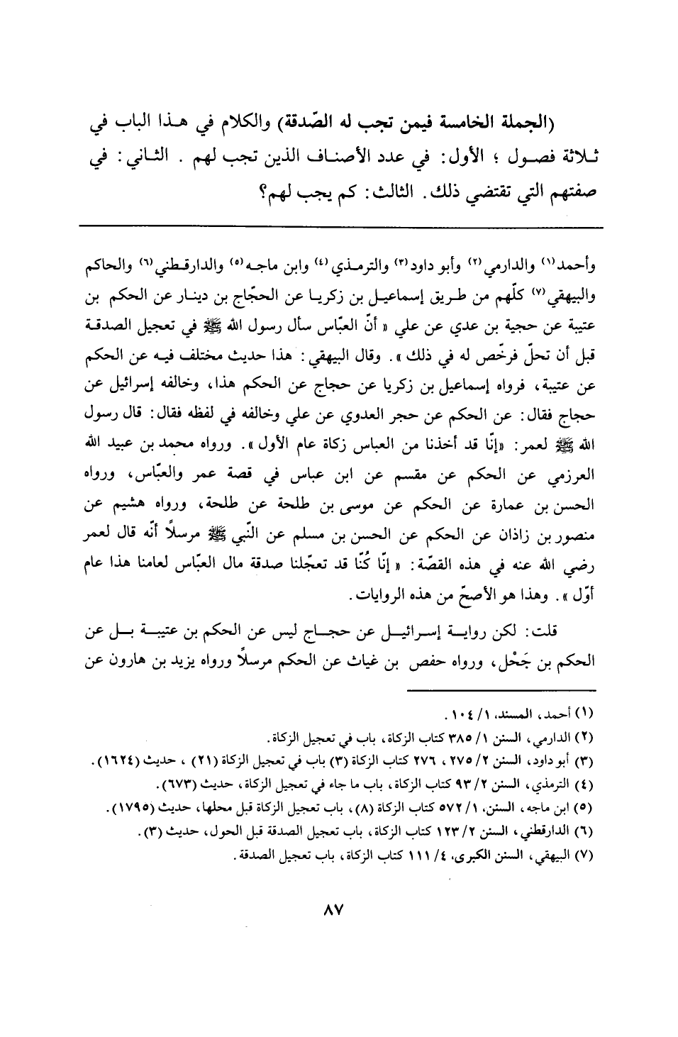 وأحمد والدارمي وأبو داود والترمذي وابن ماجه والدارقطني والحاكم والبيهقي كلهم من طريق إسماعيل بن زكريا عن الحجّاج بن دينار عن الحكم بن عتيبة عن حجية بن عدي عن علي "أن العبّاس سأل رسول الله - صلى الله عليه وسلم - في تعجيل الصدقة قبل أن تحلّ فرخص له في ذلك". وقال البيهقي: هذا حديث مختلف فيه عن الحكم عن عتيبة، فرواه إسماعيل بن زكريا عن حجاج عن الحكم هذا، وخالفه إسرائيل عن حجاج فقال: عن الحكم عن حجر العدوي عن علي وخالفه في لفظه فقال: قال رسول الله - صلى الله عليه وسلم - لعمر: "إنّا قد أخذنا من العباس زكاة عام الأول". ورواه محمَّد بن عبيد الله العرزمي عن الحكم عن مقسم عن ابن عباس في قصة عمر والعباس، ورواه الحسن بن عمارة عن الحكم عن موسى بن طلحة عن طلحة، ورواه هشيم عن منصور بن زاذان عن الحكم عن الحسن بن مسلم عن النبي - صلى الله عليه وسلم - مرسلًا أنه قال لعمر - رضي الله عنه - في هذه القصّة: "إنا كُنا قد تعجلنا صدقة مال العباس لعامنا هذا عام أوّل". وهذا هو الأصح من هذه الروايات.