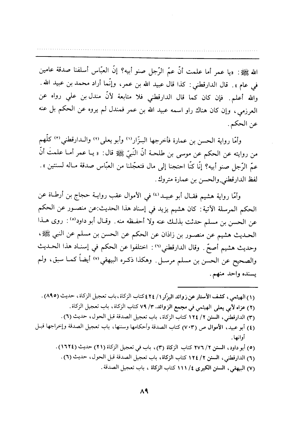 الله - صلى الله عليه وسلم -: "يا عمر أما علمت أنّ عمّ الرجل صنو أبيه؟ إنّ العباس أسلفنا صدقة عامين في عام". قال الدارقطني: كذا قال عبيد الله بن عمر، وإنما أراد محمَّد بن عبيد الله. والله أعلم. فإن كان كما قال الدارقطني فلا متابعة لأن مندل بن علي رواه عن العرزمي، وإن كان هناك راو اسمه عبيد الله بن عمر فمندل لم يروه عن الحكم بل عنه عن الحكم.