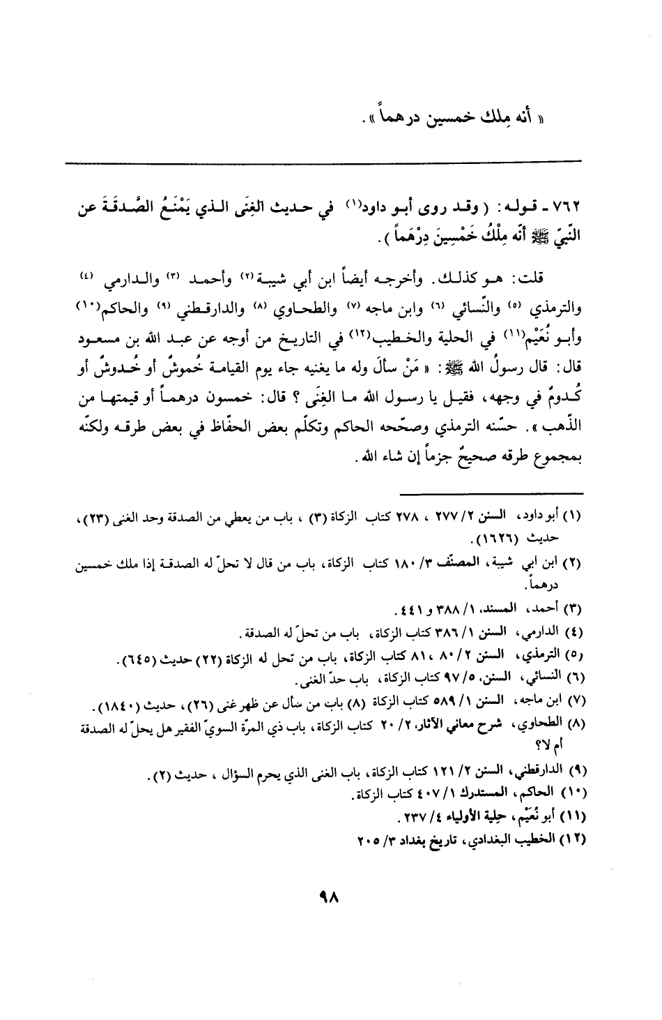 762 - قوله: (وقد روى أبو داود في حديث الغِنَى الذي يَمْنَعُ الصَّدقَةَ عن النبي - صلى الله عليه وسلم - أنّه مِلْكُ خَمْسِينَ دِرْهَمًا).