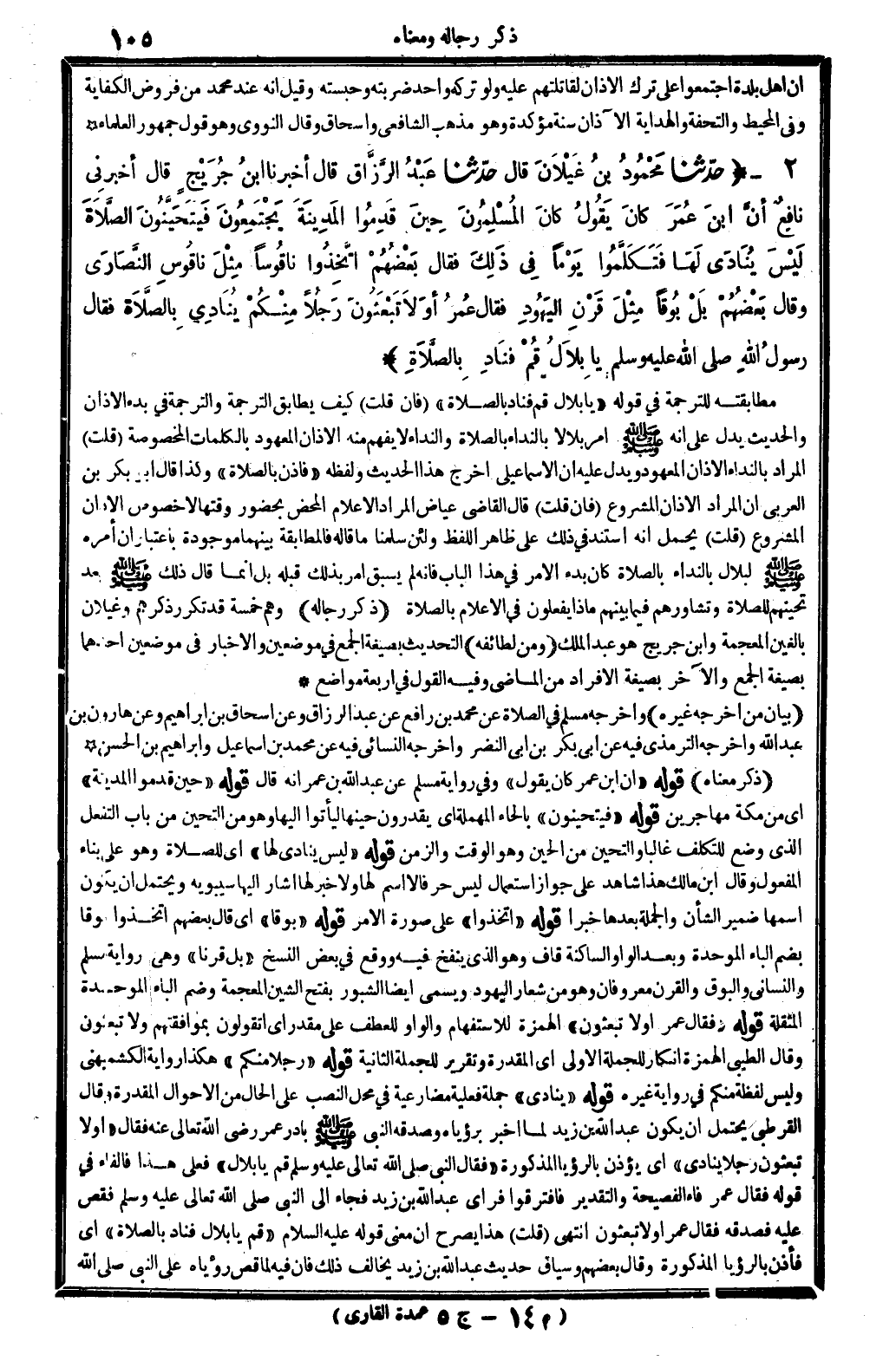 604 - حدَّثنا مَحْمُودُ بنُ غَيْلاَنَ قالَ حدَّثَنا عَبْدُ الرَّزَّاق قَالَ أخبرنَا ابنُ جُرَيْجٍ قَالَ أَخْبرنِي نافِعٌ أنَّ ابنَ عُمَرَ كانَ يَقُولُ كانَ المُسْلِمُونَ حَينَ قَدِمُوا المَدِينَةَ يَجْتَمِعُونَ فَيَتَحَيَّنُونَ الصَّلاةَ لَيْسَ يُنَادِي لَهَا فَتَكَلَّمُوا يَوْما فِي ذَلِكَ فَقَالَ بَعْضُهُمْ اتَّخَذُوا ناقُوسا مِثْلَ ناقُوسِ النَّصَارَى وَقَالَ بَعْضُهُمْ بَلْ بُوقا مِثْلَ قَرْنِ اليَهُودِ فَقَالَ عُمَرُ أوَ لاَ تَبْعَثُونَ رَجُلاً مِنْكُمْ يُنَادِي بِالصَّلاَةِ فَقَالَ رسولُ الله صلى الله عَلَيْهِ وَسلم يَا بِلاَلُ قُمْ فنَادِ بِالصَّلاَةِ. .