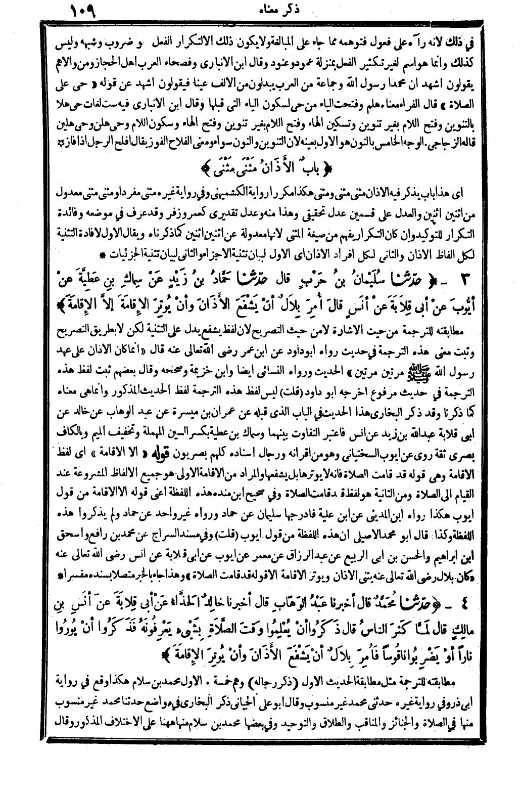 الثَّالِثَة: الترجيع فِي الْأَذَان، وَهُوَ أَن يرجع وَيرْفَع صَوته بِالشَّهَادَتَيْنِ بَعْدَمَا خفض بهما، وَبِه قَالَ الشَّافِعِي وَمَالك، إِلَّا إِنَّه لَا يُؤْتى بِالتَّكْبِيرِ فِي أَوله. إلاَّ مرَّتَيْنِ. وَقَالَ أَحْمد: إِن رجَّع فَلَا بَأْس بِهِ، وَإِن لم يرجع فَلَا بَأْس بِهِ. وَقَالَ أَبُو إِسْحَاق من أَصْحَاب الشَّافِعِي: إِن ترك الترجيع يعْتد بِهِ، وَحكى عَن بعض أَصْحَابه أَنه لَا يعْتد بِهِ كَمَا لَو ترك سَائِر كَلِمَاته، كَذَا فِي (الْحِلْية) . وَفِي (شرح الْوَجِيز) : وَالأَصَح أَنه إنْ ترك الترجيع لم يضرّهُ، وَحجَّة الشَّافِعِي حَدِيث أبي مَحْذُورَة: (أَن رَسُول الله صلى الله عَلَيْهِ وَسلم علمه الْأَذَان: الله أكبر الله أكبر، أشهد أَن لَا إِلَه إِلَّا الله، أشهد أَن لَا إِلَه إِلَّا الله، أشهد أَن مُحَمَّدًا رَسُول الله أشهد أَن مُحَمَّدًا رَسُول الله، ثمَّ يعود فَيَقُول: أشهد أَن لَا إِلَه إِلَّا الله، أشهد أَن لَا إِلَه إِلَّا الله، أشهد أَن مُحَمَّدًا رَسُول الله أشهد أَن مُحَمَّدًا رَسُول الله حَيّ على الصَّلَاة حَيّ على الصَّلَاة، حَيّ على الْفَلاح حَيّ على الْفَلاح، الله أكبر الله أكبر لَا إِلَه إِلَّا الله) . رَوَاهُ الْجَمَاعَة إلاَّ البُخَارِيّ من حَدِيث عبد الله بن محيريز عَن أبي مَحْذُورَة، وَحجَّة أَصْحَابنَا حَدِيث عبد الله بن زيد من غير تَرْجِيع فِيهِ، وَكَأن حَدِيث أبي مَحْذُورَة لأجل التَّعْلِيم فكرره، فَظن أَبُو مَحْذُورَة أَنه تَرْجِيع، وَأَنه فِي أصل الْأَذَان، وروى الطَّبَرَانِيّ فِي (مُعْجَمه الْأَوْسَط) عَن أبي مَحْذُورَة أَنه قَالَ: (ألْقى عَليّ رَسُول الله صلى الله عَلَيْهِ وَسلم الْأَذَان حرفا حرفا: الله أكبر الله أكبر) إِلَى آخِره، لم يذكر فِيهِ ترجيعا. وأذان بِلَال بِحَضْرَة رَسُول الله صلى الله عَلَيْهِ وَسلم سفرا وحضرا، وَهُوَ مُؤذن رَسُول الله صلى الله عَلَيْهِ وَسلم بإطباق أهل الْإِسْلَام إِلَى أَن توفّي رَسُول الله صلى الله عَلَيْهِ وَسلم، ومؤذن أبي بكر الصّديق رَضِي الله تَعَالَى عَنهُ إِلَى أَن توفّي من غير تَرْجِيع.