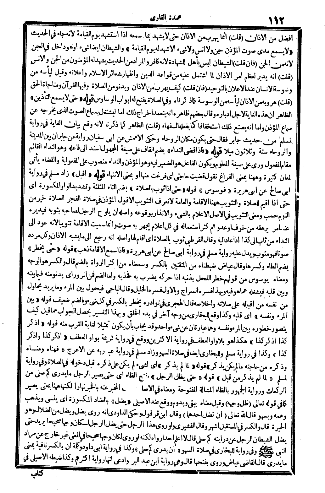 أفضل من الْأَذَان؟ قلت: إِنَّمَا يهرب من الْأَذَان حَتَّى لَا يشْهد بِمَا سَمعه إِذا اسْتشْهد يَوْم الْقِيَامَة، لِأَنَّهُ جَاءَ فِي الحَدِيث: (لَا يسمع مدى صَوت الْمُؤَذّن جن وَلَا إنس وَلَا شَيْء إِلَّا شهد لَهُ يَوْم الْقِيَامَة) . والشيطان أَيْضا شَيْء أَو هُوَ دَاخل فِي الْجِنّ، لِأَنَّهُ من الْجِنّ. فَإِن قلت: إِنَّه يدبر لعظم أَمر الْأَذَان لما اشْتَمَل عَلَيْهِ من قَوَاعِد الدّين وَإِظْهَار شَعَائِر الْإِسْلَام وإعلانه. وَقيل: ليأسه من وَسْوَسَة الْإِنْسَان عِنْد الإعلان بِالتَّوْحِيدِ. فَإِن قلت: كَيفَ يهرب من الْأَذَان وَيَدْنُو من الصَّلَاة وفيهَا الْقرَان ومناجاة الْحق؟ قلت: هروبه من الآذان ليأسه من الوسوسة، كَمَا ذَكرْنَاهُ، وَفِي الصَّلَاة، يفتح لَهُ أَبْوَاب الوساوس. قَوْله: (حَتَّى لَا يسمع التأذين) ، الظَّاهِر أَن هَذِه الْغَايَة لاجل إدباره، وَقَالَ بَعضهم: ظَاهره أَنه يتَعَمَّد إِخْرَاج ذَلِك إِمَّا ليشتغل بِسَمَاع الصَّوْت الَّذِي يُخرجهُ عَن سَماع الْمُؤَذّن، وَإِمَّا أَنه يصنع ذَلِك اسْتِخْفَافًا كَمَا يَفْعَله السُّفَهَاء قلت: الظَّاهِر كَمَا ذكرنَا، لِأَنَّهُ وَقع بَيَان الْغَايَة فِي رِوَايَة لمُسلم من حَدِيث جَابر، فَقَالَ: حَتَّى يكون مَكَان الروحاء، وَحكى الْأَعْمَش عَن أبي سُفْيَان رِوَايَة عَن جَابر أَن بَين الْمَدِينَة والروحاء سِتَّة وَثَلَاثُونَ ميلًا، قَوْله: (فَإِذا قضي النداء) ، بِضَم الْقَاف على صِيغَة الْمَجْهُول، أسْند الى فَاعله وَهُوَ النداء الْقَائِم مقَام الْمَفْعُول، وَرُوِيَ على صِيغَة الْمَعْلُوم وَيكون الْفَاعِل هُوَ الضَّمِير فِيهِ، وَهُوَ الْمُؤَذّن، والنداء مَنْصُوب على المفعولية، وَالْقَضَاء يَأْتِي لمعان كَثِيرَة، وَهَهُنَا بِمَعْنى: الْفَرَاغ. تَقول: قضيت حَاجَتي أَي: فرغت مِنْهَا أَو بِمَعْنى الِانْتِهَاء. قَوْله: (اقبل) زَاد مُسلم فِي رِوَايَة أبي صَالح عَن أبي هُرَيْرَة: (فوسوس) قَوْله: (حَتَّى إِذا ثوب بِالصَّلَاةِ) ، بِضَم الثَّاء الْمُثَلَّثَة وَتَشْديد الْوَاو الْمَكْسُورَة، أَي: حَتَّى إِذا أقيم للصَّلَاة، والتثويب هَهُنَا الْإِقَامَة، والعامة لَا تعرف التثويب إِلَّا قَول الْمُؤَذّن فِي صَلَاة الْفجْر: الصَّلَاة خير من النّوم، حسب، وَمعنى التثويب فِي الأَصْل الْإِعْلَام بالشَّيْء والإنذار بِوُقُوعِهِ، وَأَصله أَن يلوح الرجل لصَاحبه بِثَوْبِهِ فيديره عِنْد أَمر يرهقه من خوف أَو عَدو، ثمَّ كثر اسْتِعْمَاله فِي كل إِعْلَام يجْهر بِهِ صَوت، وَإِنَّمَا سميت الْإِقَامَة: تثويبا، لِأَنَّهُ عود إِلَى النداء، من: ثاب إِلَى كَذَا إِذا عَاد إِلَيْهِ، وَقَالَ الْقُرْطُبِيّ: ثوَّب بِالصَّلَاةِ أَي: أَقَامَ لَهَا، وَأَصله أَنه رَجَعَ إِلَى مَا يشبه الْأَذَان، وكل مردد صَوتا فَهُوَ مثوب، وَيدل عَلَيْهِ رِوَايَة مُسلم فِي رِوَايَة أبي صَالح عَن أبي هُرَيْرَة: (فَإِذا سمع الْإِقَامَة ذهب) . قَوْله: (حَتَّى يخْطر) ، بِضَم الطَّاء وَكسرهَا، وَقَالَ عِيَاض: ضبطناه من المتقنين بِالْكَسْرِ، وسمعناه من أَكثر الروَاة بِالضَّمِّ، قَالَ: وَالْكَسْر هُوَ الْوَجْه، وَمَعْنَاهُ: يوسوس، من قَوْلهم: خطر الْفَحْل بِذَنبِهِ إِذا حركه يضْرب بِهِ فَخذيهِ، وَأما الضَّم، فَمن المروراي: يدنو مِنْهُ فِيمَا بَينه وَبَين قلبه فيشغله عَمَّا هُوَ فِيهِ، وَبِهَذَا فسره السراج، وبالأول فسره الْخَلِيل، وَقَالَ الْبَاجِيّ: فيحول بَين الْمَرْء وَمَا يُرِيد يحاول من نَفسه من إقباله على صلَاته وإخلاصه. قَالَ الهجري فِي (نوادره) : يخْطر، بِالْكَسْرِ، فِي كل شَيْء، وبالضم ضَعِيف. قَوْله: (بَين الْمَرْء وَنَفسه) أَي: قلبه، وَكَذَا وَقع للْبُخَارِيّ من وَجه اخر فِي بَدْء الْخلق: وَبِهَذَا التَّفْسِير يحصل الْجَواب عَمَّا قيل: كَيفَ يتَصَوَّر خطورة بَين الْمَرْء وَنَفسه، وهما عبارتان عَن شَيْء وَاح