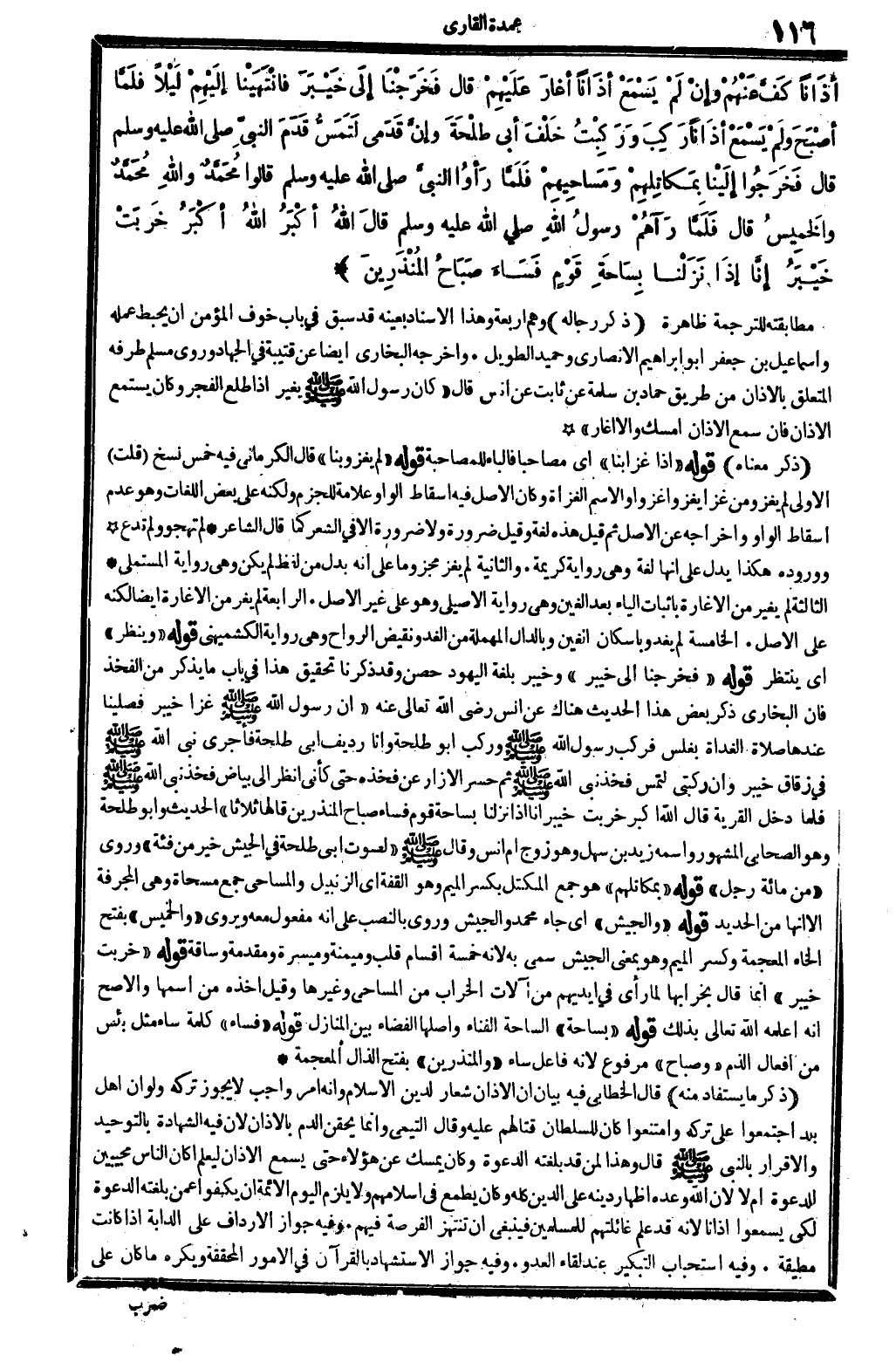 ووروده هَكَذَا يدل على أَنَّهَا لُغَة، وَهِي، رِوَايَة كَرِيمَة. وَالثَّانيَِة: لم يغز، مَجْزُومًا على أَنه بدل من لفظ: لم يكن. وَهِي رِوَايَة الْمُسْتَمْلِي. الثَّالِثَة: لم يُغير، من الإغارات بِإِثْبَات الْيَاء بعد الْغَيْن، وَهِي رِوَايَة الْأصيلِيّ، وَهُوَ على غير الأَصْل. الرَّابِعَة: لم يغر من الإغارة أَيْضا لكنه على الأَصْل. الْخَامِسَة: لم يَغْدُو، بِإِسْكَان الْغَيْن وبالدال الْمُهْملَة من: الغدو، ونقيض الرواح وَهِي رِوَايَة الْكشميهني. قَوْله: (وَينظر) ، أَي: ينْتَظر. قَوْله: (فخرجنا إِلَى خَيْبَر) ، وخيبر بلغَة الْيَهُود: حصن، وَقد ذكرنَا تَحْقِيق هَذَا فِي: بَاب مَا يذكر من الْفَخْذ، فَإِن البُخَارِيّ ذكر بعض هَذَا الحَدِيث هُنَاكَ عَن أنس رَضِي الله تَعَالَى عَنهُ: (أَن رَسُول الله صلى الله عَلَيْهِ وَسلم غزا خَيْبَر فصلينا عِنْدهَا صَلَاة الْغَدَاة بِغَلَس، فَركب رَسُول الله صلى الله عَلَيْهِ وَسلم وَركب أَبُو طَلْحَة وَأَنا رَدِيف أبي طَلْحَة، فَأجرى نَبِي الله صلى الله عَلَيْهِ وَسلم فِي زقاق خَيْبَر، وَإِن ركبتي لتمس فَخذ نَبِي الله صلى الله عَلَيْهِ وَسلم، ثمَّ حسر الْإِزَار عَن فَخذه حَتَّى كَأَنِّي أنظر إِلَى بَيَاض فَخذ نَبِي الله صلى الله عَلَيْهِ وَسلم، فَلَمَّا دخل الْقرْيَة قَالَ: الله أكبر، خربَتْ خَيْبَر إِنَّا إِذا نزلنَا بِسَاحَة قوم فسَاء صباح الْمُنْذرين، قَالَهَا ثَلَاثًا) الحَدِيث. وَأَبُو طَلْحَة وَهُوَ الصَّحَابِيّ الْمَشْهُور، واسْمه: زيد بن سهل، وَهُوَ زوج أم أنس. وَقَالَ صلى الله عَلَيْهِ وَسلم: (لصوت أبي طَلْحَة فِي الْجَيْش خير من فِئَة) ، وَرُوِيَ: (من مائَة رجل) قَوْله: (بمكاتلهم) ، هُوَ جمع: المكتل، بِكَسْر الْمِيم وَهُوَ: القفة، أَي: الزنبيل، والمساحي، جمع: مسحاة وَهِي: المجرفة إِلَّا أَنَّهَا من الْحَدِيد. قَوْله: (والجيش) أَي: جَاءَ مُحَمَّد والجيش، وَرُوِيَ بِالنّصب على أَنه مفعول مَعَه، ويروى (وَالْخَمِيس) ، بِفَتْح الْخَاء الْمُعْجَمَة وَكسر الْمِيم وَهُوَ بِمَعْنى: الْجَيْش، سمي بِهِ لِأَنَّهُ خَمْسَة أَقسَام: قلب وميمنة وميسرة ومقدمة وساقة. قَوْله: (خربَتْ خَيْبَر) ، إِنَّمَا قَالَ بخرابها لما رأى فِي أَيْديهم من الات الخراب من الْمساحِي وَغَيرهَا، وَقيل: أَخذه من اسْمهَا، وَالأَصَح أَنه أعلمهُ الله تَعَالَى بذلك. قَوْله: (بِسَاحَة) الساحة: الفناء، وَأَصلهَا: الفضاء بَين الْمنَازل. قَوْله: (فسَاء) كلمة: سَاءَ، مثل: بئس، من أَفعَال الذَّم و: (صباح) مَرْفُوع لِأَنَّهُ فَاعل: سَاءَ و: (الْمُنْذرين) ، بِفَتْح الذَّال الْمُعْجَمَة.