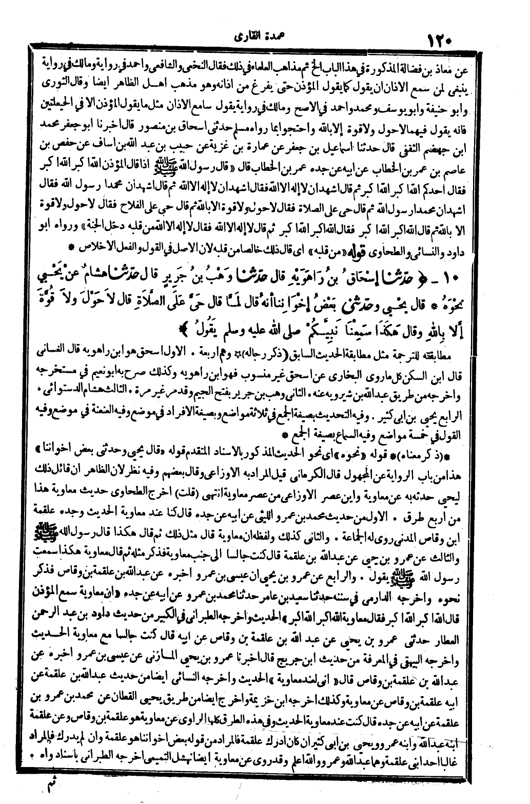 قلت: أخرج الطَّحَاوِيّ حَدِيث مُعَاوِيَة هَذَا من أَربع طرق: الأول: من حَدِيث مُحَمَّد بن عَمْرو اللَّيْثِيّ عَن أَبِيه عَن جده، قَالَ: كُنَّا عِنْد مُعَاوِيَة ... الحَدِيث، وجده عَلْقَمَة ابْن وَقاص الْمدنِي، روى لَهُ الْجَمَاعَة. وَالثَّانِي: كَذَلِك، وَلَفظه: أَن مُعَاوِيَة قَالَ مثل ذَلِك، ثمَّ قَالَ: هَكَذَا قَالَ رَسُول الله صلى الله عَلَيْهِ وَسلم. والثاالث: عَن عَمْرو بن يحيى عَن عبد الله بن عَلْقَمَة، قَالَ: كنت جَالِسا إِلَى جنب مُعَاوِيَة، فَذكر مثله، ثمَّ قَالَ مُعَاوِيَة: هَكَذَا سَمِعت رَسُول الله صلى الله عَلَيْهِ وَسلم يَقُول. وَالرَّابِع: عَن عَمْرو بن يحيى أَن عِيسَى بن عَمْرو أخبرهُ عَن عبد الله بن عَلْقَمَة بن وَقاص، فَذكر نَحوه. وَأخرجه الدَّارمِيّ فِي (سنَنه) : حَدثنَا سعيد بن عَامر حَدثنَا مُحَمَّد بن عَمْرو عَن أَبِيه عَن جده: أَن مُعَاوِيَة سمع الْمُؤَذّن قَالَ: الله أكبر الله أكبر فَقَالَ مُعَاوِيَة: الله أكبر الله أكبر) الحَدِيث. وَأخرجه الطَّبَرَانِيّ فِي (الْكَبِير) من حَدِيث دَاوُد بن عبد الرَّحْمَن الْعَطَّار: حَدثنِي عَمْرو بن يحيى عَن عبد الله بن عَلْقَمَة بن وَقاص عَن أَبِيه قَالَ: كنت جَالِسا مَعَ مُعَاوِيَة ... الحَدِيث. وَأخرجه الْبَيْهَقِيّ فِي (الْمعرفَة) من حَدِيث ابْن جريج، قَالَ: أخبرنَا عَمْرو بن يحيى الْمَازِني عَن عِيسَى بن عَمْرو أخبرهُ عَن عبد الله بن عَلْقَمَة بن وَقاص، قَالَ: (أَنِّي لعِنْد مُعَاوِيَة) الحَدِيث. وَأخرجه النَّسَائِيّ أَيْضا من حَدِيث عبد الله بن عَلْقَمَة عَن أَبِيه عَلْقَمَة بن وَقاص عَن مُعَاوِيَة. وَكَذَلِكَ أخرجه ابْن خُزَيْمَة، وَأخرج أَيْضا من طَرِيق يحيى الْقطَّان عَن مُحَمَّد بن عَمْرو بن عَلْقَمَة عَن أَبِيه عَن جده، قَالَ: كنت عِنْد مُعَاوِيَة ... الحَدِيث. وَفِي هَذِه الطّرق كلهَا الرَّاوِي عَن مُعَاوِيَة هُوَ عَلْقَمَة بن وَقاص، وَعَن عَلْقَمَة ابْنه عبد الله، وَابْنه عَمْرو، وَيحيى بن أبي كثير إِن كَانَ أدْرك عَلْقَمَة فَالْمُرَاد من قَوْله: بعض اخواننا هُوَ: عَلْقَمَة، وَأَن لم يدْرك فَالْمُرَاد غَالِبا أحد ابْني عَلْقَمَة، وهما: عبد الله وَعَمْرو، وَالله أعلم. وَقد روى عَن مُعَاوِيَة أَيْضا نهشل التَّمِيمِي، أخرجه الطَّبَرَانِيّ بإسنادٍ واهٍ.
