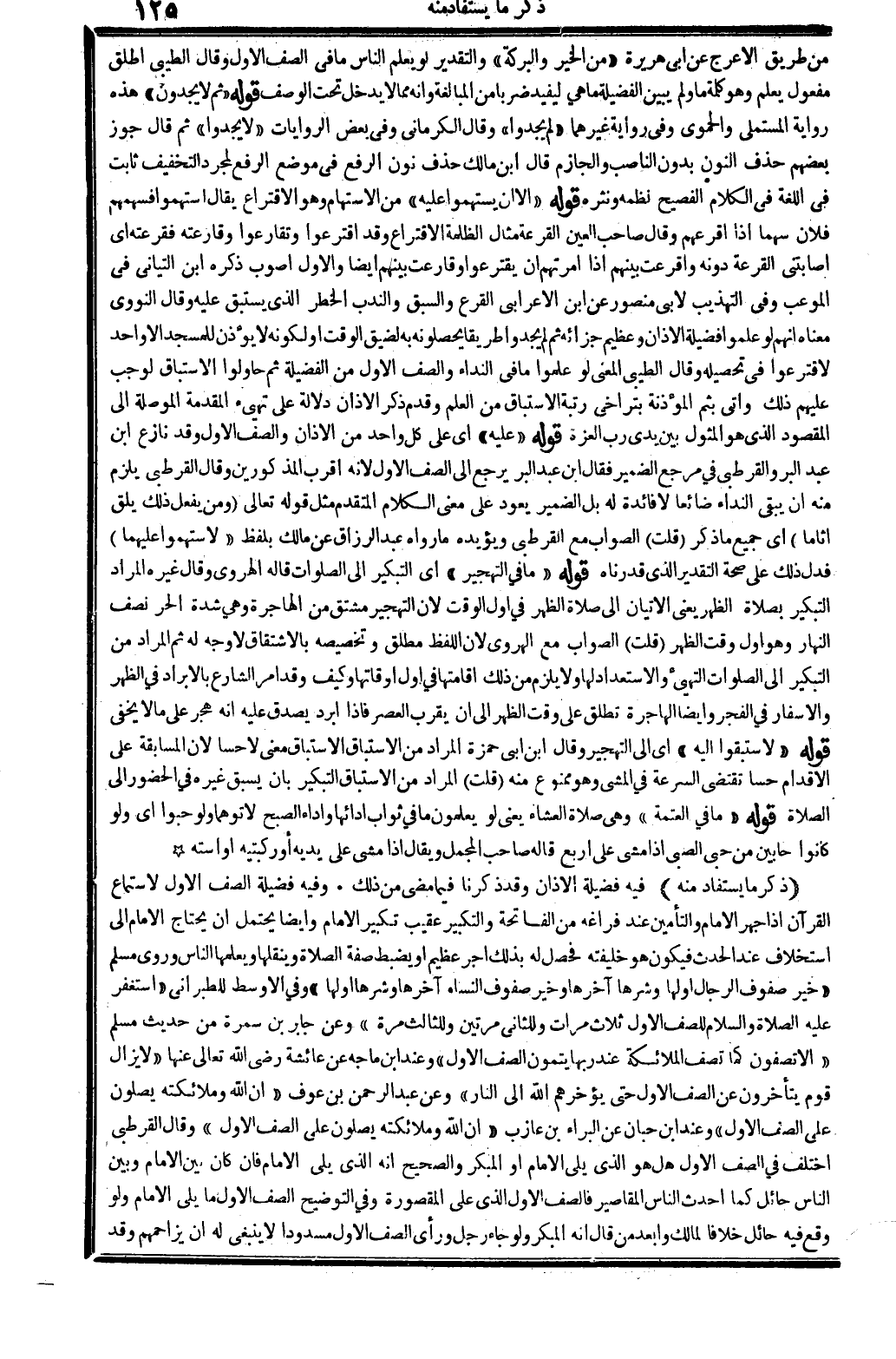 من طَرِيق الْأَعْرَج عَن أبي هُرَيْرَة: (من الْخَيْر وَالْبركَة) ، وَالتَّقْدِير: لَو يعلم النَّاس مَا فِي الصَّفّ الأول؟ وَقَالَ الطَّيِّبِيّ: أطلق مفعول: يعلم، وَهُوَ كلمة: مَا، وَلم يبين الْفَضِيلَة مَا هِيَ ليُفِيد ضربا من الْمُبَالغَة، وَأَنه مِمَّا لَا يدْخل تَحت الْوَصْف. قَوْله: (ثمَّ لَا يَجدونَ) ، هَذِه رِوَايَة الْمُسْتَمْلِي والحموي، وَفِي رِوَايَة غَيرهمَا: (لم يَجدوا) . وَقَالَ الْكرْمَانِي: وَفِي بعض الرِّوَايَات: (لَا يَجدوا) ، ثمَّ قَالَ: جوز بَعضهم حذف النُّون بِدُونِ الناصب والجازم، قَالَ ابْن مَالك: حذف نون الرّفْع فِي مَوضِع الرّفْع لمُجَرّد التَّخْفِيف ثَابت فِي اللُّغَة فِي الْكَلَام الفصيح نظمه ونثره. قَوْله: (إِلَّا أَن يستهموا عَلَيْهِ) من الاستهام وَهُوَ الاقتراع، يُقَال: استهموا فسهمهم فلَان سَهْما إِذا أقرعهم، وَقَالَ صَاحب (الْعين) : الْقرعَة مِثَال الظلمَة، الاقتراع، وَقد اقترعوا وتقارعوا وقارعته فقرعته أَي: أصابتني الْقرعَة دونه، وأقرعت بَينهم: إِذا أَمرتهم أَن يقترعوا، وقارعت بَينهم أَيْضا، وَالْأول أصوب، ذكره ابْن التياني فِي (الموعب) وَفِي (التَّهْذِيب) لأَبي مَنْصُور عَن ابْن الْأَعرَابِي: القرع والسبق وَالنَّدْب: الْخطر الَّذِي يستبق عَلَيْهِ. وَقَالَ النَّوَوِيّ: مَعْنَاهُ أَنهم لَو علمُوا فَضِيلَة الْأَذَان وعظيم جَزَائِهِ، ثمَّ لم يَجدوا طَرِيقا يحصلونه بِهِ لضيق الْوَقْت أَو لكَونه لَا يُؤذن لِلْمَسْجِدِ إلاَّ وَاحِد لاقترعوا فِي تَحْصِيله. وَقَالَ الطَّيِّبِيّ: الْمَعْنى: لَو علمُوا مَا فِي النداء والصف الأول من الْفَضِيلَة، ثمَّ حاولوا الاستباق، لوَجَبَ عَلَيْهِم ذَلِك، وأتى: بثم، الْمُؤَذّن بتراخي رُتْبَة الاستباق من الْعلم، وَقدم ذكر الْأَذَان دلَالَة على تهيء الْمُقدمَة الموصلة إِلَى الْمَقْصُود الَّذِي هُوَ المثول بَين يَدي رب الْعِزَّة. قَوْله: (عَلَيْهِ) أَي: على كل وَاحِد من الْأَذَان والصف الأول، وَقد نَازع ابْن عبد الْبر والقرطبي فِي مرجع الضَّمِير، فَقَالَ ابْن عبد الْبر: يرجع إِلَى الصَّفّ الأول لِأَنَّهُ أقرب الْمَذْكُورين. وَقَالَ الْقُرْطُبِيّ: يلْزم مِنْهُ أَن يبْقى النداء ضائعا لَا فَائِدَة لَهُ، بل الضَّمِير يعود على معنى الْكَلَام الْمُتَقَدّم، مثل قَوْله تَعَالَى: {وَمن يفعل ذَلِك يلق أثاما} (الْفرْقَان: 68) . أَي: جَمِيع مَا ذكر. قلت: الصَّوَاب مَعَ الْقُرْطُبِيّ، وَيُؤَيِّدهُ مَا رَوَاهُ عبد الرَّزَّاق عَن مَالك بِلَفْظ: (لاستهموا عَلَيْهِمَا) ، فَدلَّ ذَلِك على صِحَة التَّقْدِير الَّذِي قدرناه. قَوْله: (مَا فِي التهجير) أَي: التَّكْبِير إِلَى الصَّلَوَات. قَالَه الْهَرَوِيّ: وَقَالَ غَيره: المُرَاد التبكير بِصَلَاة الظّهْر، يَعْنِي الأتيان إِلَى صَلَاة الظّهْر فِي أول الْوَقْت، لِأَن التهجير مُشْتَقّ من الهاجرة وَهِي شدَّة الْحر نصف النَّهَار، وَهُوَ أول وَقت الظّهْر. قلت: الصَّوَاب مَعَ الْهَرَوِيّ، لِأَن اللَّفْظ مُطلق وتخصيصه بالاشتقاق لَا وَجه لَهُ. ثمَّ المُرَاد من التبكير إِلَى الصَّلَوَات التهيء والاستعداد لَهَا، وَلَا يلْزم من ذَلِك إِقَامَتهَا فِي أول أَوْقَاتهَا، وَكَيف وَقد أَمر الشَّارِع بالإبراد فِي الظّهْر، والإسفار فِي الْفجْر؟ وَأَيْضًا الهاجرة تطلق على وَقت الظّهْر إِلَى أَن يقرب الْعَصْر، فَإِذا أبرد يصدق عَلَيْهِ أَنه هجر على مَا لَا يخفى. قَوْله: (لاستبقوا إِلَيْهِ) أَي: إِلَى التهجير. وَقَالَ ابْن أبي حَمْزَة: المُرَاد من الاستباق التبكير، بِأَن يسْبق غَيره فِي الْحُضُور إِلَى الصَّلَاة. قَوْله: (مَا فِي الْعَتَمَة) ، وَهِي صَلَاة الْعشَاء، يَعْنِي: لَو يعلمُونَ مَا فِي ثَوَاب أَدَائِهَا وَأَدَاء (الصُّبْح لأتوهما وَلَو حبوا) أَي: وَلَو كَانُوا حابين، من: حبى الصَّبِي إِذا مَشى على أَربع. قَالَه صَاحب (الْمُجْمل) . وَيُقَال: إِذا مَشى على 