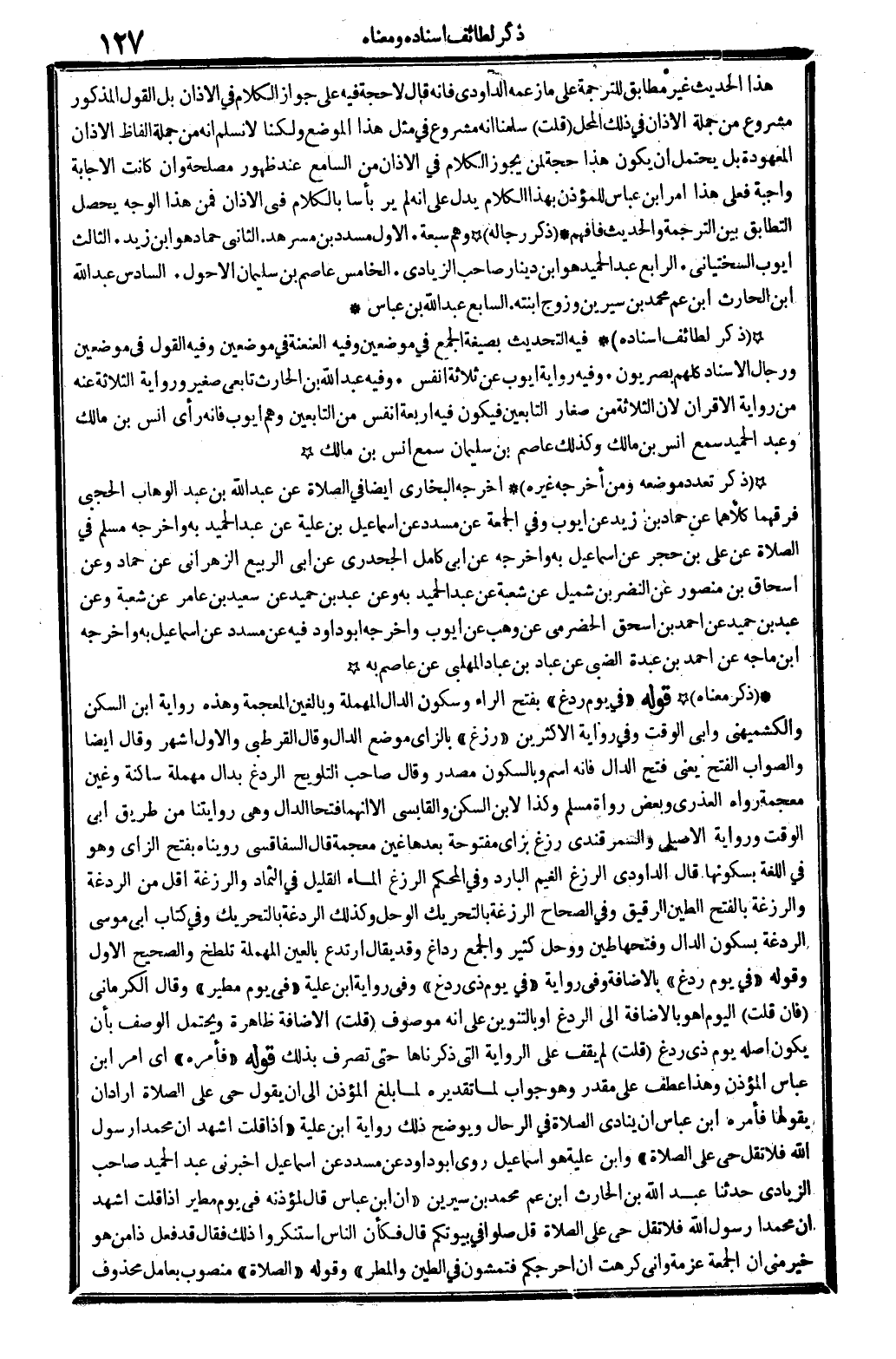 ذكر لطائف إِسْنَاده فِيهِ: التحديث بِصِيغَة الْجمع فِي موضِعين. وَفِيه: العنعنة فِي موضِعين. وَفِيه: القَوْل فِي موضِعين وَرِجَال الْإِسْنَاد كلهم بصريون. وَفِيه: رِوَايَة أَيُّوب عَن ثَلَاثَة أنفس. وَفِيه: عبد الله بن الْحَارِث تَابِعِيّ صَغِير، وَرِوَايَة الثَّلَاثَة عَنهُ من رِوَايَة الأقران، لِأَن الثَّلَاثَة من صغَار التَّابِعين، فَيكون فِيهِ أَرْبَعَة أنفس من التَّابِعين، وهم أَيُّوب فَإِنَّهُ رأى أنس بن مَالك، وَعبد الحميد. سمع أنس بن مَالك، وَكَذَلِكَ عَاصِم بن سُلَيْمَان سمع أنس بن مَالك.