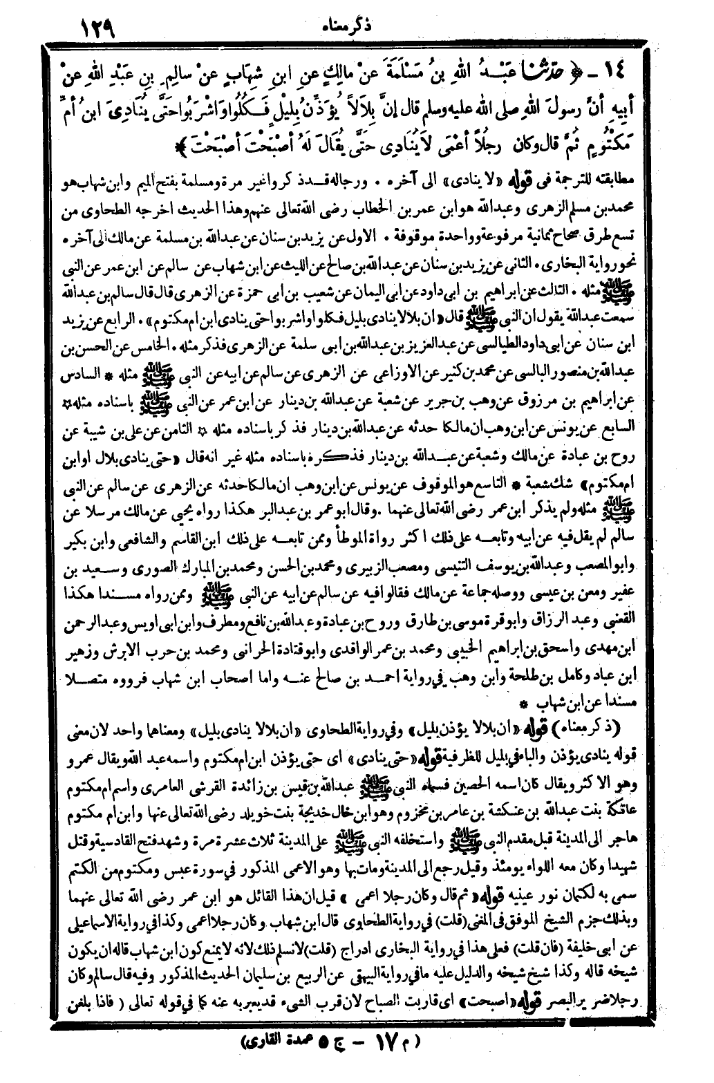 وَهَذَا الحَدِيث أخرجه الطَّحَاوِيّ من تسع طرق صِحَاح: ثَمَانِيَة مَرْفُوعَة، وَوَاحِدَة مَوْقُوفَة. الأول: عَن يزِيد بن سِنَان عَن عبد الله بن مسلمة عَن مَالك إِلَى آخِره، نَحْو رِوَايَة البُخَارِيّ. الثَّانِي: عَن يزِيد بن سِنَان عَن عبد الله بن صَالح عَن اللَّيْث عَن ابْن شهَاب عَن سَالم عَن ابْن عمر عَن النَّبِي صلى الله عَلَيْهِ وَسلم مثله. الثَّالِث: عَن إِبْرَاهِيم بن أبي دَاوُد عَن أبي الْيَمَان عَن شُعَيْب بن أبي حَمْزَة عَن الزُّهْرِيّ، قَالَ: قَالَ سَالم بن عبد الله: سَمِعت عبد الله يَقُول: إِن النَّبِي صلى الله عَلَيْهِ وَسلم قَالَ: (إِن بِلَالًا يُنَادي بلَيْل فَكُلُوا وَاشْرَبُوا حَتَّى يُنَادي ابْن أم مَكْتُوم) . الرَّابِع: عَن يزِيد ابْن سِنَان عَن أبي دَاوُد الطَّيَالِسِيّ عَن عبد الْعَزِيز بن عبد الله بن أبي سَلمَة عَن الزُّهْرِيّ، فَذكر مثله. الْخَامِس: عَن الْحسن بن عبد الله بن مَنْصُور البالسي عَن مُحَمَّد بن كثير عَن الْأَوْزَاعِيّ عَن الزُّهْرِيّ عَن سَالم عَن أَبِيه عَن النَّبِي صلى الله عَلَيْهِ وَسلم مثله. السَّادِس: عَن إِبْرَاهِيم بن مَرْزُوق عَن وهب بن جرير عَن شُعْبَة عَن عبد الله بن دِينَار عَن ابْن عمر عَن النَّبِي صلى الله عَلَيْهِ وَسلم بِإِسْنَادِهِ، مثله. السَّابِع: عَن يُونُس عَن ابْن وهب أَن مَالِكًا حَدثهُ عَن عبد الله بن دِينَار، فَذكر بِإِسْنَادِهِ مثله. الثَّامِن: عَن عَليّ بن شيبَة عَن روح بن عبَادَة عَن مَالك وَشعْبَة عَن عبد الله بن دِينَار، فَذكره بِإِسْنَادِهِ مثله، غير أَنه قَالَ: (حَتَّى يُنَادي بِلَال أَو ابْن أم مَكْتُوم) ، شكّ شُعْبَة. التَّاسِع: هُوَ الْمَوْقُوف عَن يُونُس عَن ابْن وهب أَن مَالِكًا حَدثهُ عَن الزُّهْرِيّ عَن سَالم عَن النَّبِي صلى الله عَلَيْهِ وَسلم مثله، وَلم يذكر ابْن عمر، رَضِي الله تَعَالَى عَنْهُمَا.