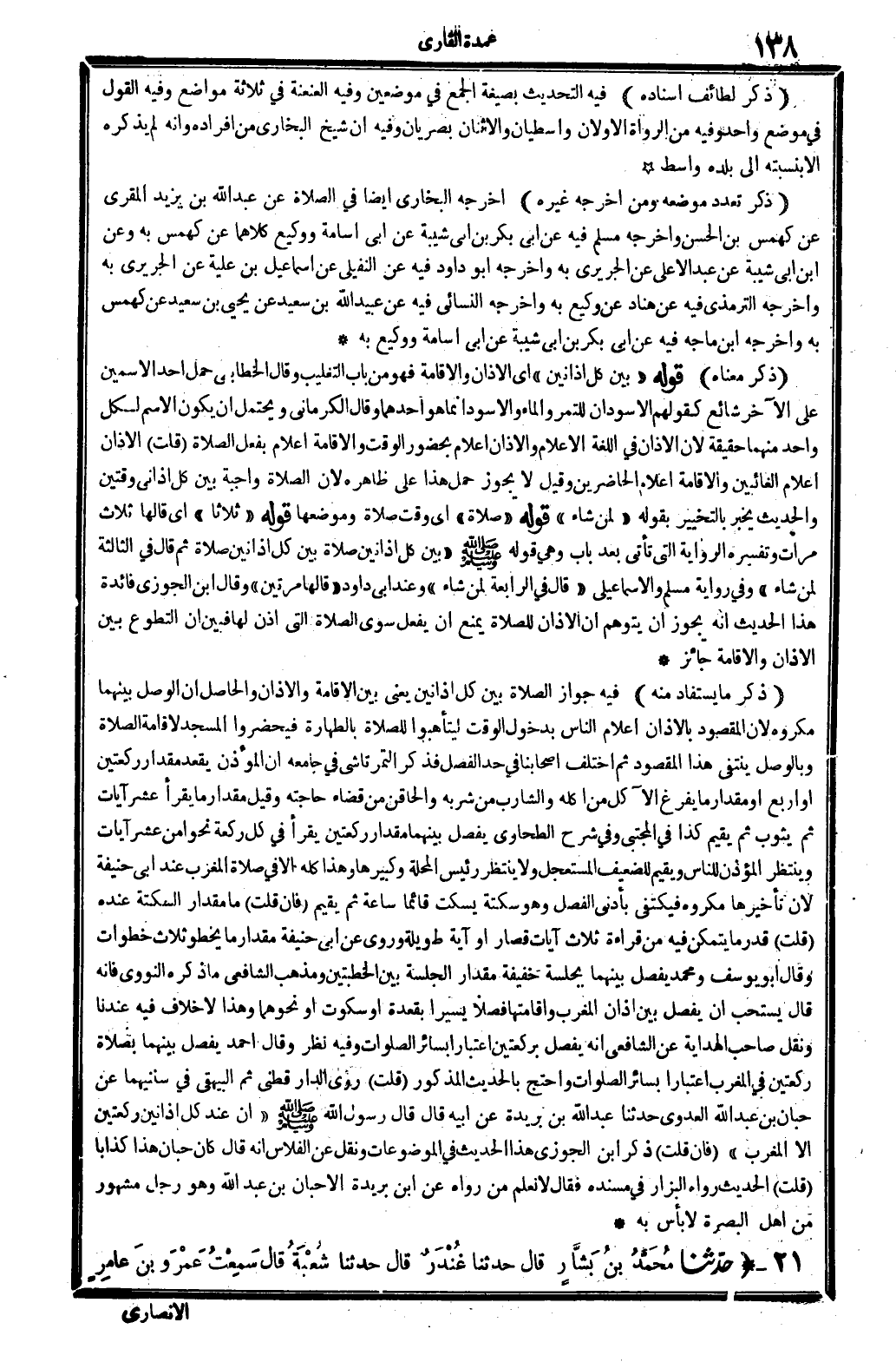 (ذكر لطائف إِسْنَاده) فِيهِ التحديث بِصِيغَة الْجمع فِي موضِعين وَفِيه العنعنة فِي ثَلَاثَة مَوَاضِع وَفِيه القَوْل فِي مَوضِع وَاحِد وَفِيه من الروَاة الْأَوَّلَانِ واسطيان والاثنان بصريان وَفِيه أَن شيخ البُخَارِيّ من أَفْرَاده وَأَنه لم يذكرهُ إِلَّا بنسبته إِلَى بَلَده وَاسِط (ذكر تعدد مَوْضِعه وَمن أخرجه غَيره) أخرجه البُخَارِيّ أَيْضا فِي الصَّلَاة عَن عبد الله بن يزِيد الْمقري عَن كهمس بن الْحسن وَأخرجه مُسلم فِيهِ عَن أبي بكر بن أبي شيبَة عَن أبي أُسَامَة ووكيع كِلَاهُمَا عَن كهمس بِهِ وَعَن ابْن أبي شيبَة عَن عبد الْأَعْلَى عَن الْجريرِي بِهِ وَأخرجه أَبُو دَاوُد فِيهِ عَن النُّفَيْلِي عَن إِسْمَاعِيل بن علية عَن الْجريرِي بِهِ وَأخرجه التِّرْمِذِيّ فِيهِ عَن هناد عَن وَكِيع بِهِ وَأخرجه النَّسَائِيّ فِيهِ عَن عبيد الله بن سعيد عَن يحيى بن سعيد عَن كهمس بِهِ وَأخرجه ابْن مَاجَه فِيهِ عَن أبي بكر بن أبي شيبَة عَن أبي أُسَامَة ووكيع بِهِ (ذكر مَعْنَاهُ) قَوْله " بَين كل أذانين " أَي الْأَذَان وَالْإِقَامَة فَهُوَ من بَاب التغليب وَقَالَ الْخطابِيّ حمل أحد الاسمين على الآخر شَائِع كَقَوْلِهِم الأسودان للتمر وَالْمَاء وَالْأسود إِنَّمَا هُوَ أَحدهمَا وَقَالَ الْكرْمَانِي وَيحْتَمل أَن يكون الِاسْم لكل وَاحِد مِنْهُمَا حَقِيقَة لِأَن الْأَذَان فِي اللُّغَة الْإِعْلَام وَالْأَذَان إِعْلَام بِحُضُور الْوَقْت وَالْإِقَامَة إِعْلَام بِفعل الصَّلَاة (قلت) الْأَذَان إِعْلَام الغائبين وَالْإِقَامَة إِعْلَام الْحَاضِرين وَقيل لَا يجوز حمل هَذَا على ظَاهره لِأَن الصَّلَاة وَاجِبَة بَين كل أذاني وَقْتَيْنِ والْحَدِيث يخبر بالتخيير بقوله " لمن شَاءَ " قَوْله " صَلَاة " أَي وَقت صَلَاة وموضعها قَوْله " ثَلَاثًا " أَي قَالَهَا ثَلَاث مَرَّات وتفسره الرِّوَايَة الَّتِي تَأتي بعد بَاب وَهِي قَوْله - صَلَّى اللَّهُ عَلَيْهِ وَسَلَّم َ - " بَين كل أذانين صَلَاة بَين كل أذانين صَلَاة ثمَّ قَالَ فِي الثَّالِثَة لمن شَاءَ " وَفِي رِوَايَة مُسلم والإسماعيلي " قَالَ فِي الرَّابِعَة لمن شَاءَ " وَعند أبي دَاوُد " قَالَهَا مرَّتَيْنِ " وَقَالَ ابْن الْجَوْزِيّ فَائِدَة هَذَا الحَدِيث أَنه يجوز أَن يتَوَهَّم أَن الْأَذَان للصَّلَاة يمْنَع أَن يفعل سوى الصَّلَاة الَّتِي أذن لَهَا فَبين أَن التَّطَوُّع بَين الْأَذَان وَالْإِقَامَة جَائِز (ذكر مَا يُسْتَفَاد مِنْهُ) فِيهِ جَوَاز الصَّلَاة بَين كل أذانين يَعْنِي بَين الْإِقَامَة وَالْأَذَان وَالْحَاصِل أَن الْوَصْل بَينهمَا مَكْرُوه لِأَن الْمَقْصُود بِالْأَذَانِ إِعْلَام النَّاس بِدُخُول الْوَقْت لِيَتَأَهَّبُوا للصَّلَاة بِالطَّهَارَةِ فيحضروا الْمَسْجِد لإِقَامَة الصَّلَاة وبالوصل يَنْتَفِي هَذَا الْمَقْصُود ثمَّ اخْتلف أَصْحَابنَا فِي حد الْفَصْل فَذكر التُّمُرْتَاشِيّ فِي جَامعه أَن الْمُؤَذّن يقْعد مِقْدَار رَكْعَتَيْنِ أَو أَربع أَو مِقْدَار مَا يفرغ الْآكِل من أكله والشارب من شربه والحاقن من قَضَاء حَاجته وَقيل مِقْدَار مَا يقْرَأ عشر آيَات ثمَّ يثوب ثمَّ يُقيم كَذَا فِي الْمُجْتَبى وَفِي شرح الطَّحَاوِيّ يفصل بَينهمَا مِقْدَار رَكْعَتَيْنِ يقْرَأ فِي كل رَكْعَة نَحوا من عشر آيَات وينتظر الْمُؤَذّن للنَّاس وَيُقِيم للضعيف المستعجل وَلَا ينْتَظر رَئِيس الْمحلة وكبيرها وَهَذَا كُله إِلَّا فِي صَلَاة الْمغرب عِنْد أبي حنيفَة لِأَن تَأْخِيرهَا مَكْرُوه فيكتفي بِأَدْنَى الْفَصْل وَهُوَ سكتة يسكت قَائِما سَاعَة ثمَّ يُقيم (فَإِن قلت) مَا مِقْدَار السكتة عِنْده (قلت) قدر مَا يتَمَكَّن فِيهِ من قِرَاءَة ثَلَاث آيَات قصار أَو آيَة طَوِيلَة وَرُوِيَ عَن أبي حنيفَة مِقْدَار مَا يخطو ثَلَاث خطوَات وَقَالَ أَبُو يُوسُف وَمُحَمّد يفصل بَينهمَا بجلسة خَفِيفَة مِقْدَار الجلسة بَي