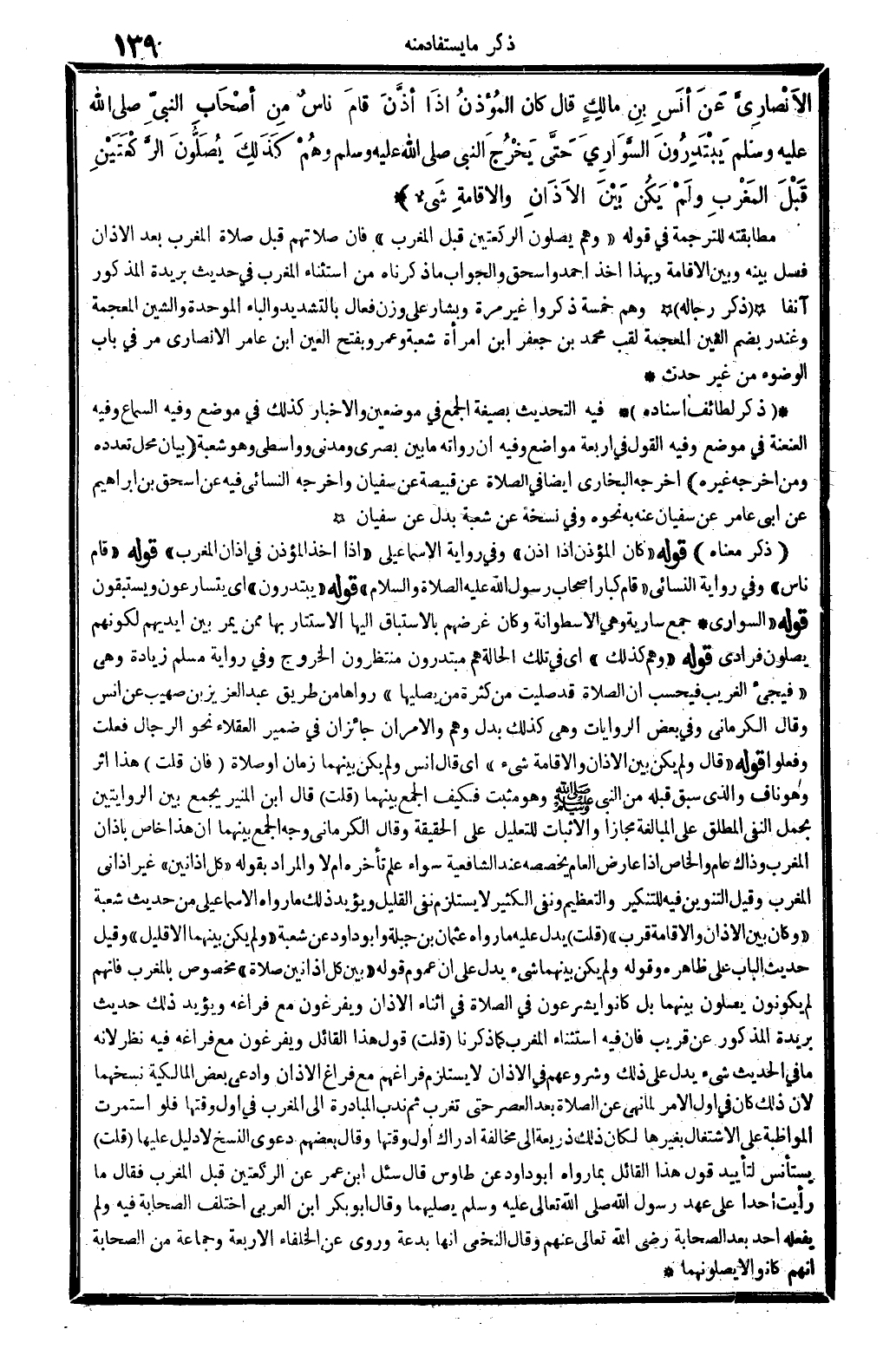 الأنصَارِيَّ عَنْ أنَسِ بنِ مالِكٍ قَالَ كَانَ المُؤَذِّنُ إذَا أذَّنَ قامَ ناسٌ مِن أصْحَابِ النَّبِيِّ صلى الله عَلَيْهِ وَسلم يَبْتَدِرُونَ السَّوَارِيَ حَتَّى يَخْرُجَ النبيُّ صلى الله عَلَيْهِ وَسلم وهُمْ كَذَلِكَ يُصَلُّونَ الرَّكْعَتَيْنِ قَبْلَ المَغْرَبِ ولَمْ يَكُنْ بَيْنَ الآذَانِ والإقَامَةِ شَيْءٌ (انْظُر الحَدِيث 503) .
