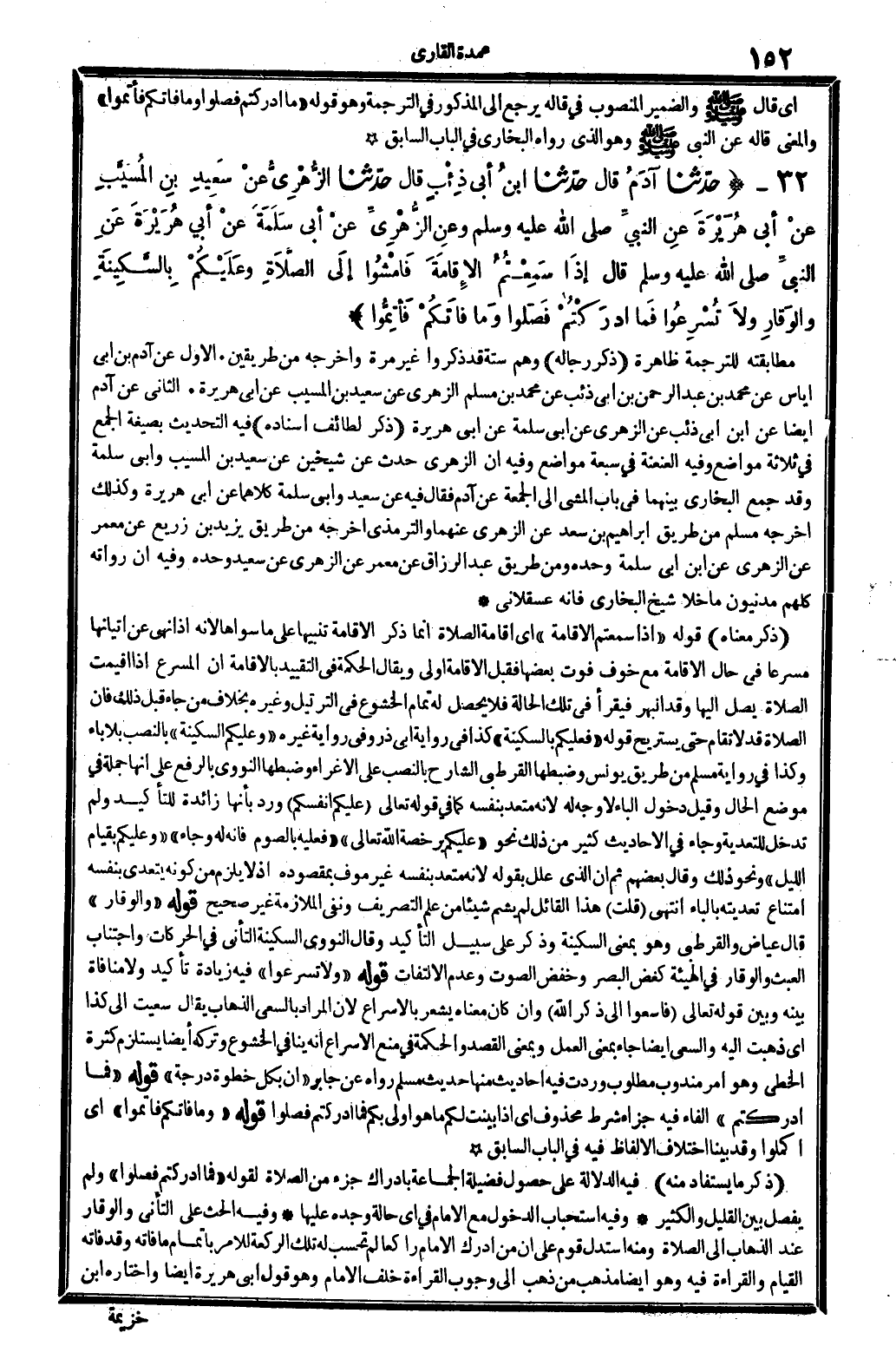 ذكر مَعْنَاهُ: قَوْله: (إِذا سَمِعْتُمْ الْإِقَامَة) أَي: إِقَامَة الصَّلَاة، إِنَّمَا ذكر الْإِقَامَة تَنْبِيها على مَا سواهَا لِأَنَّهُ إِذا نهى عَن إتيانها مسرعا فِي حَال الْإِقَامَة مَعَ خوف فَوت بَعْضهَا، فَقبل الْإِقَامَة أولى. وَيُقَال: الْحِكْمَة فِي التَّقْيِيد بِالْإِقَامَةِ أَن المسرع إِذا أُقِيمَت الصَّلَاة يصل إِلَيْهَا وَقد انبهر، فَيقْرَأ فِي تِلْكَ الْحَالة فَلَا يحصل لَهُ تَمام الْخُشُوع فِي الترتيل، وَغَيره، بِخِلَاف من جَاءَ قبل ذَلِك، فَإِن الصَّلَاة قد لَا تُقَام حَتَّى يستريح. قَوْله: فَعَلَيْكُم بِالسَّكِينَةِ) كَذَا فِي رِوَايَة أبي ذَر، وَفِي رِوَايَة غَيره: (وَعَلَيْكُم السكينَة) ، بِالنّصب بِلَا: بَاء، وَكَذَا فِي رِوَايَة مُسلم من طَرِيق يُونُس، وضبطها الْقُرْطُبِيّ الشَّارِح بِالنّصب على الإغراء، وضبطها النَّوَوِيّ بِالرَّفْع على أَنَّهَا جملَة فِي مَوضِع الْحَال. وَقيل: دُخُول الْبَاء لَا وَجه لَهُ لِأَنَّهُ مُتَعَدٍّ بِنَفسِهِ، كَمَا فِي قَوْله تَعَالَى: {عَلَيْكُم أَنفسكُم} (الْمَائِدَة: 105) ورد بِأَنَّهَا زَائِدَة للتَّأْكِيد، وَلم تدخل للتعدية. وَجَاء فِي الْأَحَادِيث كثير من ذَلِك نَحْو: (عَلَيْكُم بِرُخْصَة الله تَعَالَى) ، (فَعَلَيهِ بِالصَّوْمِ فَإِنَّهُ لَهُ وَجَاء) ، (وَعَلَيْكُم بِقِيَام اللَّيْل) . وَنَحْو ذَلِك. وَقَالَ بَعضهم: ثمَّ إِن الَّذِي علل بقوله لِأَنَّهُ مُتَعَدٍّ بِنَفسِهِ غير موف بمقصوده، إِذْ لَا يلْزم من كَونه يتَعَدَّى بِنَفسِهِ امْتنَاع تعديته بِالْبَاء. انْتهى. قلت: هَذَا الْقَائِل لم يشم شَيْئا من علم التصريف، وَنفى الْمُلَازمَة غير صَحِيح. قَوْله: (وَالْوَقار) قَالَ عِيَاض والقرطبي: وَهُوَ بِمَعْنى السكينَة، وَذكر على سَبِيل التَّأْكِيد. وَقَالَ النَّوَوِيّ: السكينَة: التأني فِي الحركات وَاجْتنَاب الْعَبَث وَالْوَقار فِي الْهَيْئَة، كغض الْبَصَر وخفض الصَّوْت وَعدم الِالْتِفَات. قَوْله: (وَلَا تسرعوا) ، فِيهِ زِيَادَة تَأْكِيد، وَلَا مُنَافَاة بَينه وَبَين قَوْله تَعَالَى: {فَاسْعَوْا إِلَى ذكر الله} (الْجُمُعَة: 9) وَإِن كَانَ مَعْنَاهُ يشْعر بالإسراع، لِأَن المُرَاد بالسعي الذّهاب، يُقَال: سعيت إِلَى كَذَا أَي: ذهبت إِلَيْهِ، وَالسَّعْي أَيْضا جَاءَ بِمَعْنى: الْعَمَل، وَبِمَعْنى: الْقَصْد. وَالْحكمَة فِي منع الْإِسْرَاع أَنه يُنَافِي الْخُشُوع، وَتَركه أَيْضا يسْتَلْزم كَثْرَة الخطى، وَهُوَ أَمر مَنْدُوب مَطْلُوب، وَردت فِيهِ أَحَادِيث: مِنْهَا حَدِيث مُسلم رَوَاهُ عَن جَابر: (إِن بِكُل خطْوَة دَرَجَة) . قَوْله: (فَمَا أدركتم) : الْفَاء، فِيهِ جَزَاء شَرط مَحْذُوف، أَي: إِذا بيّنت لكم مَا هُوَ أولى بكم فَمَا أدركتم فصلوا. قَوْله: (وَمَا فاتكم فَأتمُّوا) أَي: أكملوا، وَقد بَينا اخْتِلَاف الْأَلْفَاظ فِيهِ فِي الْبَاب السَّابِق.