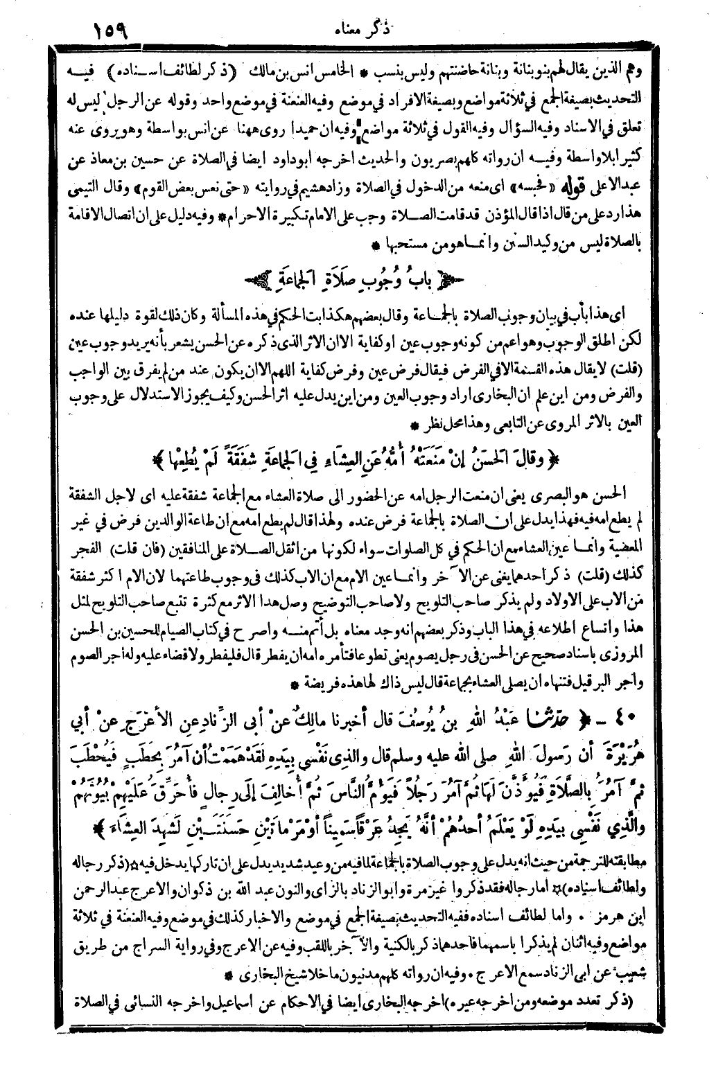 40 - (حَدثنَا عبد الله بن يُوسُف قَالَ أخبرنَا مَالك عَن أبي الزِّنَاد عَن الْأَعْرَج عَن أبي هُرَيْرَة أَن رَسُول الله - صَلَّى اللَّهُ عَلَيْهِ وَسَلَّم َ - قَالَ وَالَّذِي نَفسِي بِيَدِهِ لقد هَمَمْت أَن آمُر بحطب فيحطب ثمَّ آمُر بِالصَّلَاةِ فَيُؤذن لَهَا ثمَّ آمُر رجلا فيؤم النَّاس ثمَّ أُخَالِف إِلَى رجال فَأحرق عَلَيْهِم بُيُوتهم وَالَّذِي نَفسِي بِيَدِهِ لَو يعلم أحدهم أَنه يجد عرقا سمينا أَو مرماتين حسنتين لشهد الْعشَاء) مطابقته للتَّرْجَمَة من حَيْثُ أَنه يدل على وجوب الصَّلَاة بِالْجَمَاعَة لما فِيهِ من وَعِيد شَدِيد يدل على أَن تاركها يدْخل فِيهِ (ذكر رِجَاله ولطائف إِسْنَاده) أما رِجَاله فقد ذكرُوا غير مرّة وَأَبُو زناد بالزاي وَالنُّون عبد الله بن ذكْوَان والأعرج عبد الرَّحْمَن بن هُرْمُز. وَأما لطائف إِسْنَاده فَفِيهِ التحديث بِصِيغَة الْجمع فِي مَوضِع وَالْأَخْبَار كَذَلِك فِي مَوضِع وَفِيه العنعنة فِي ثَلَاثَة مَوَاضِع وَفِيه اثْنَان لم يذكرَا باسمهما فأحدهما ذكر بالكنية وَالْآخر باللقب وَفِيه عَن الْأَعْرَج وَفِي رِوَايَة السراج من طَرِيق شُعَيْب عَن أبي الزِّنَاد سمع الْأَعْرَج. وَفِيه أَن رُوَاته كلهم مدنيون مَا خلا شيخ البُخَارِيّ (ذكر تعدد مَوْضِعه وَمن أخرجه غَيره) أخرجه البُخَارِيّ أَيْضا فِي الْأَحْكَام عَن إِسْمَاعِيل وَأخرجه النَّسَائِيّ فِي الصَّلَاة